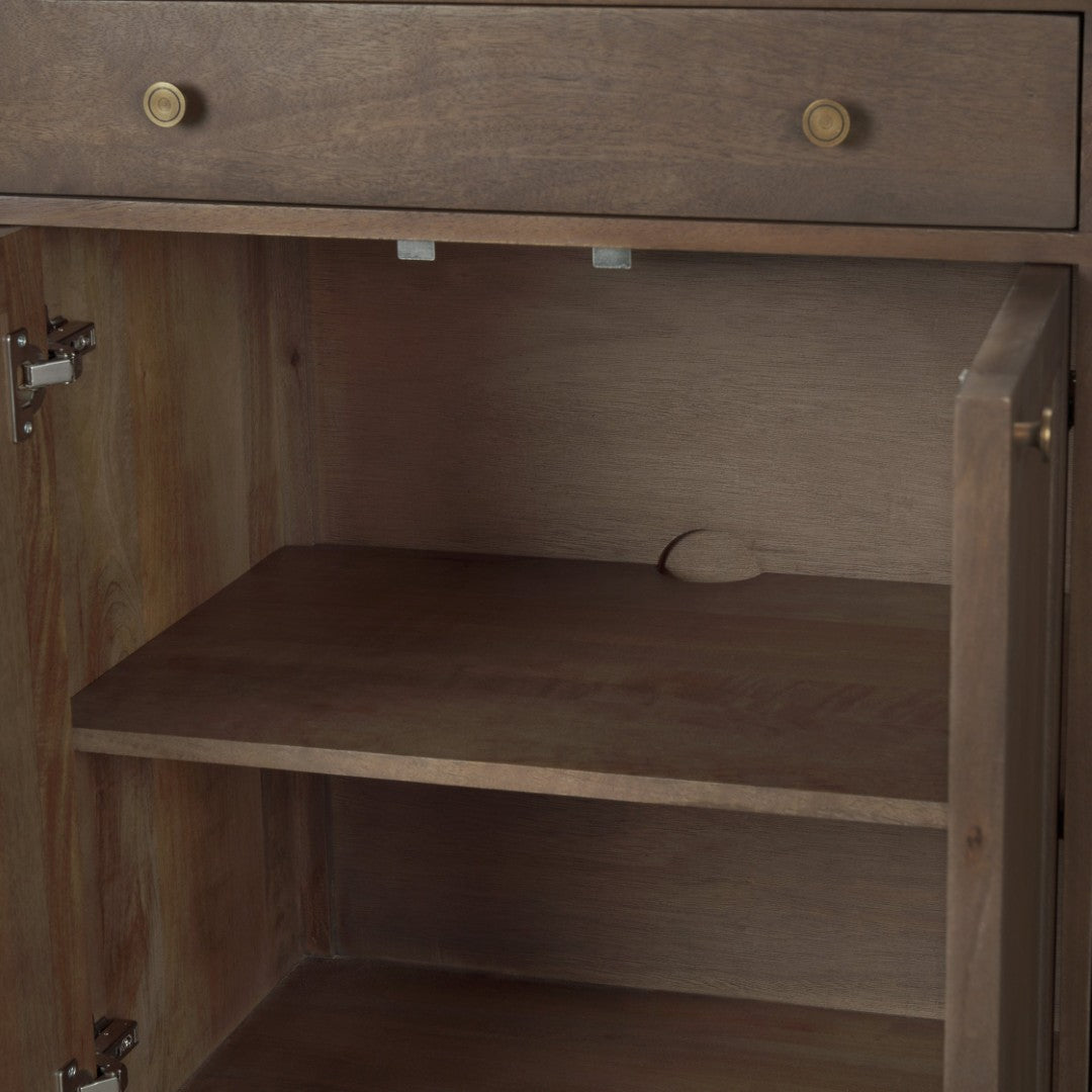 - Materials: Constructed from solid mango wood for durability and natural character; antiqued aged brass–finish iron knobs for a classic, upscale look.