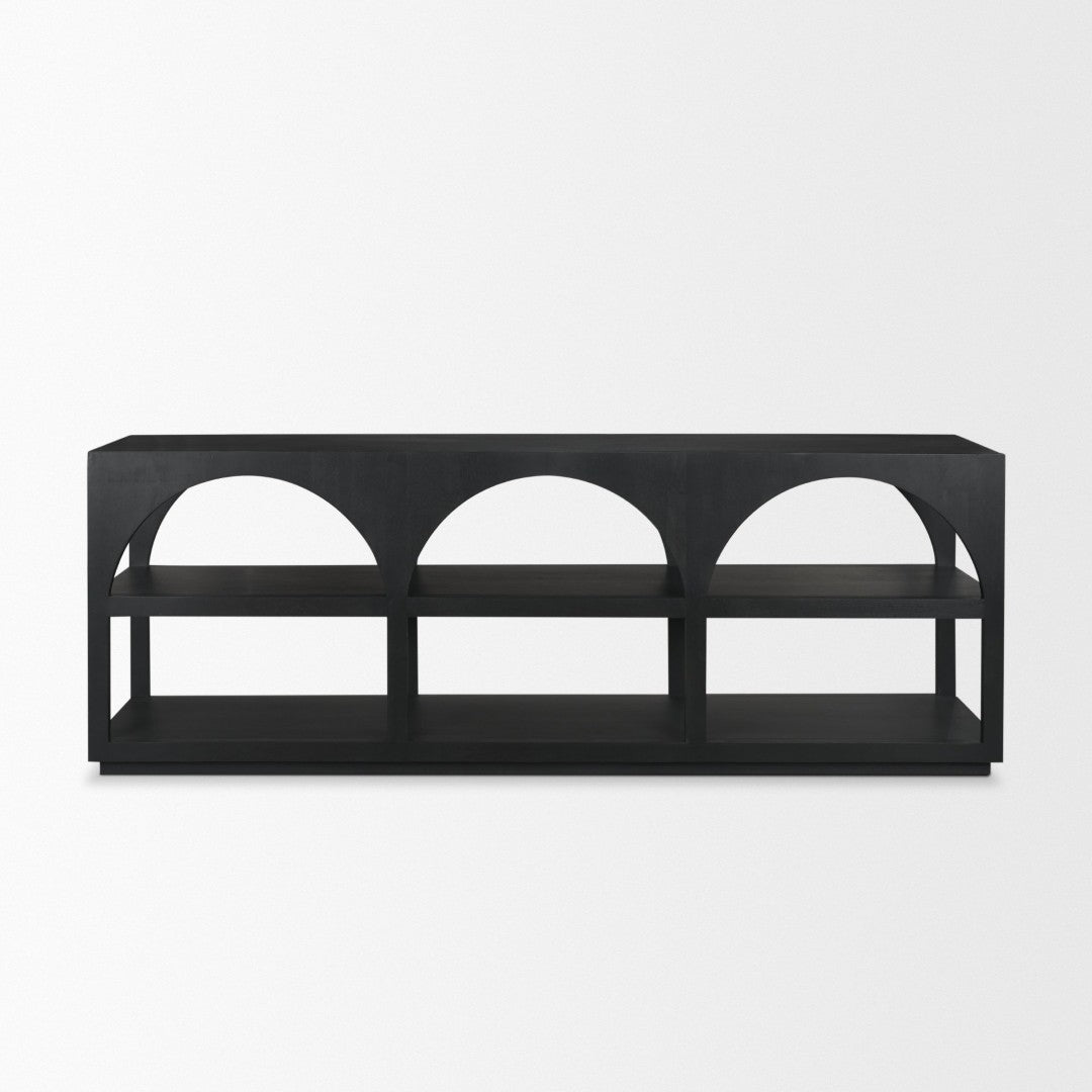 Elevate your entryway or living space with this striking arched console table that blends artisanal craftsmanship with functional storage. Crafted from solid mango wood and finished in a warm medium brown, its sculptural three-arch design and two open shelves create an airy, elegant silhouette that suits modern, transitional, and rustic interiors alike.