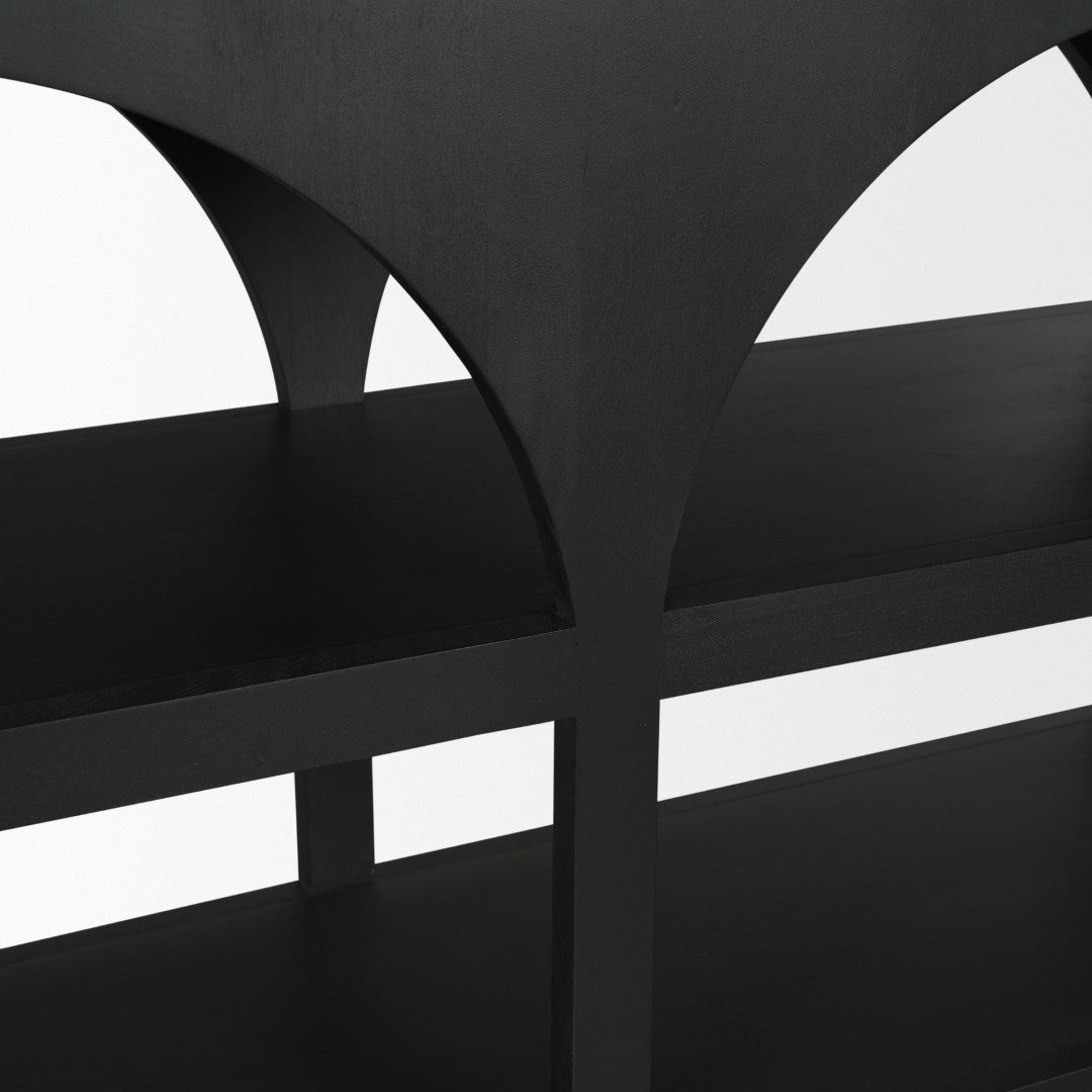 - The arched frames and open shelving lend an airy nature to the artistic design.