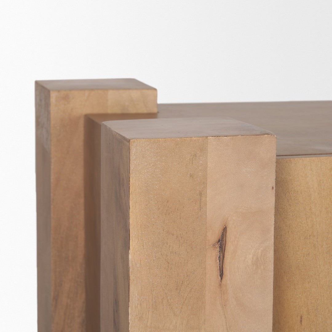 - Crafted from mango wood and finished in a soft light brown stain with subtle white pickling.