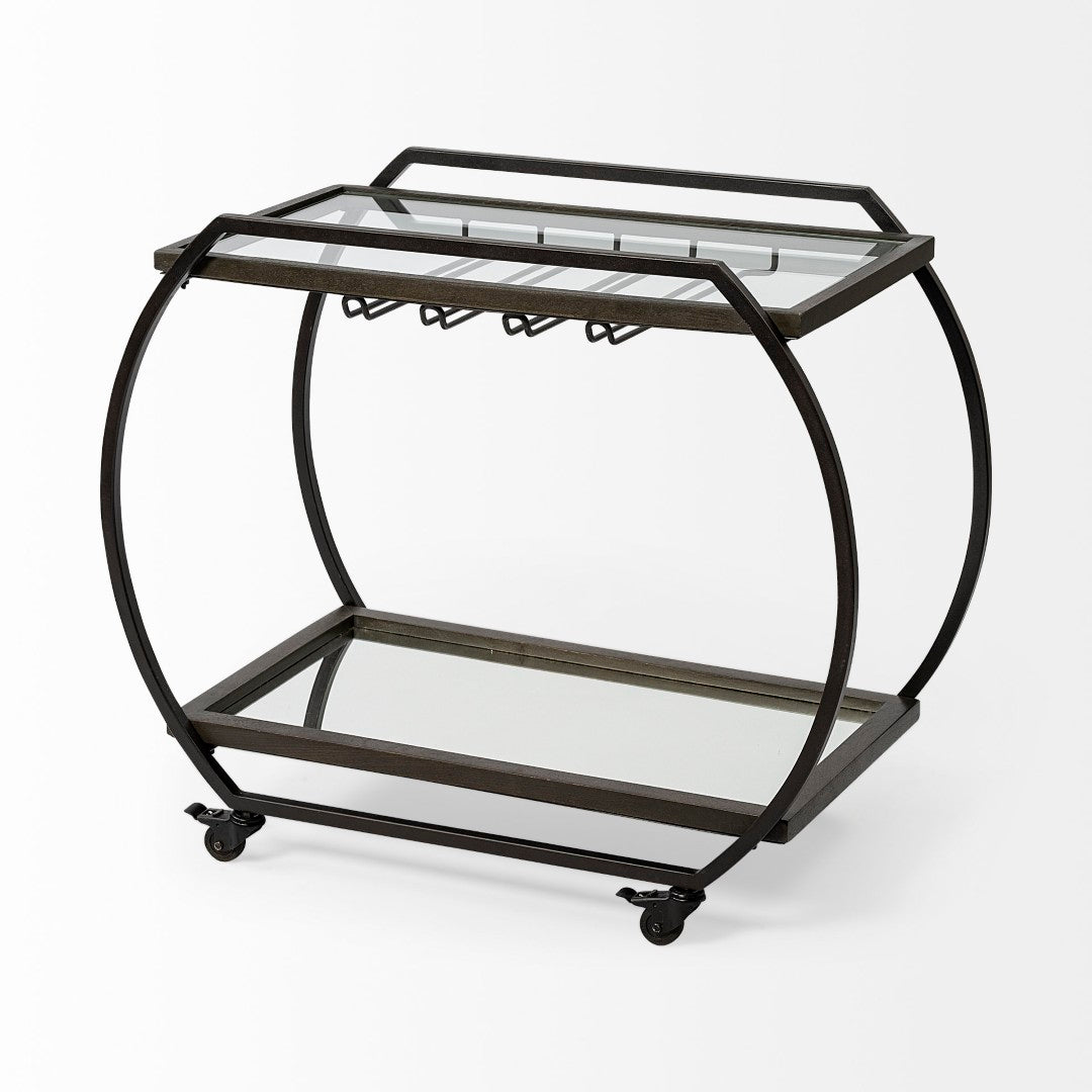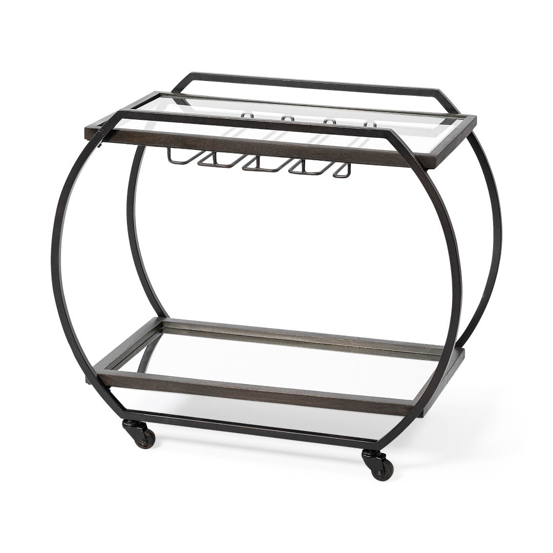 - Expertly crafted from wood and matte-black metal, the Chriselle is a unique rolling cart featuring an oval chassis that braces two wood framed rectangular glass shelves, and the bottom of the two is mirrored.