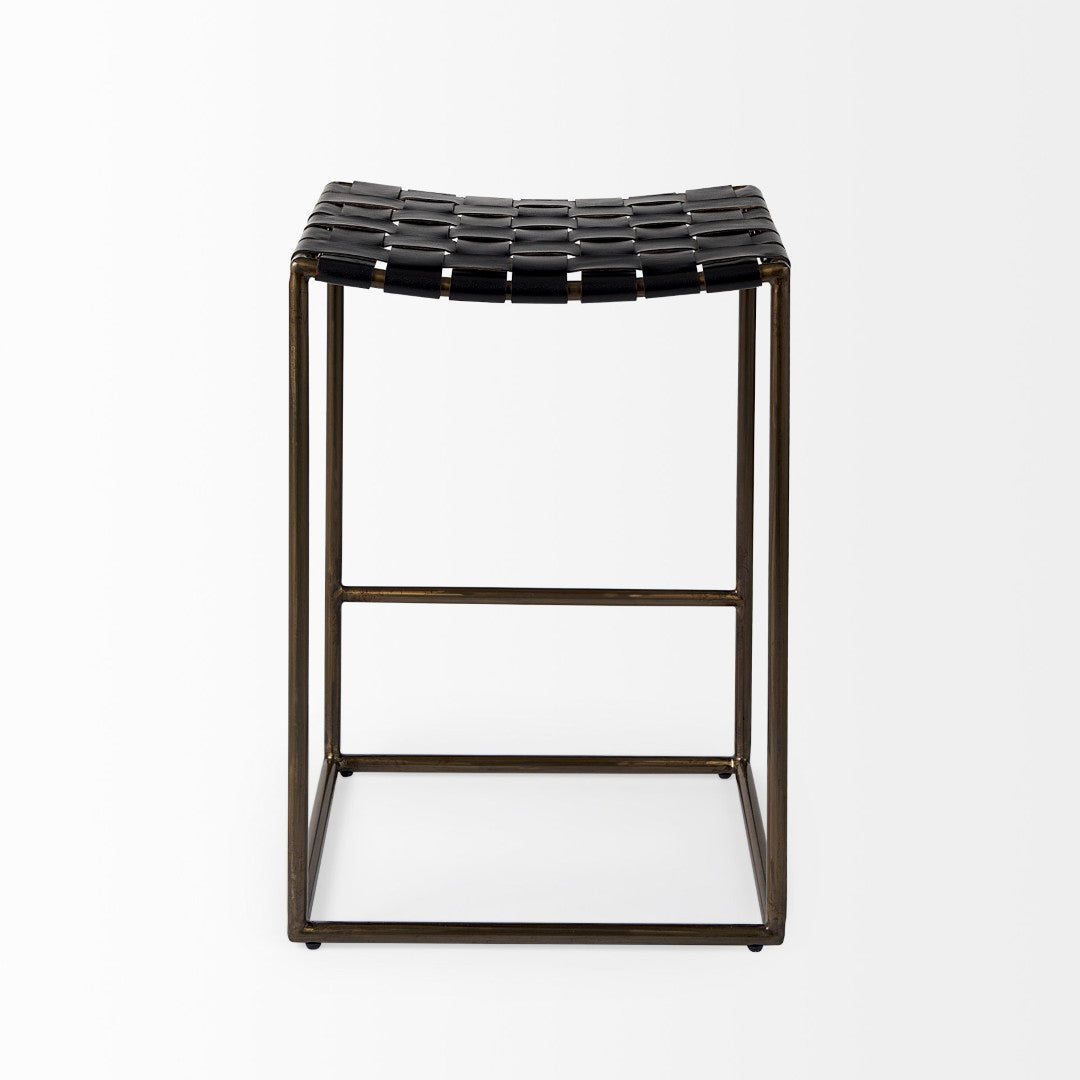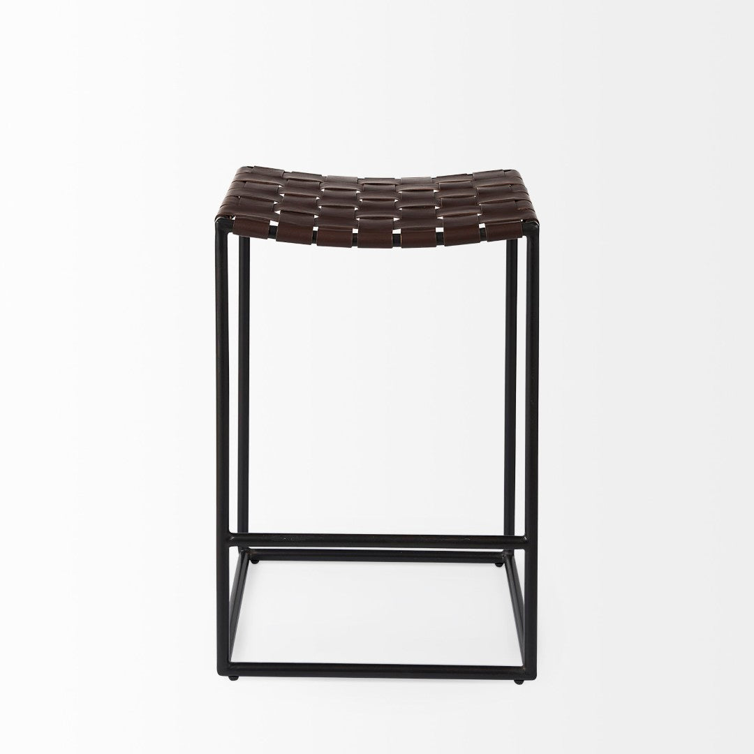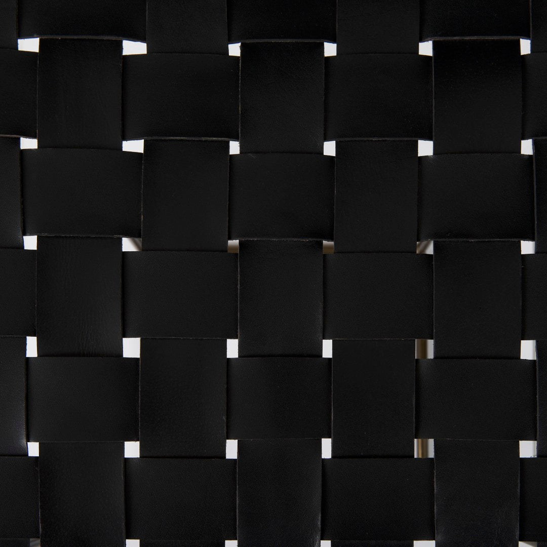 A stylish blend of industrial strength and handcrafted detail, this counter stool brings durable support and distinctive visual texture to kitchens, bars, or casual dining spaces. The Clarissa features a woven dark brown leather seat set on a matte black iron frame, offering a compact yet comfortable seating option that complements modern and industrial interiors.