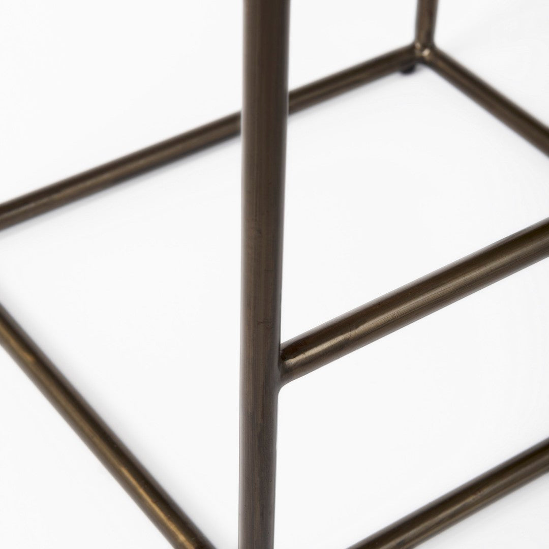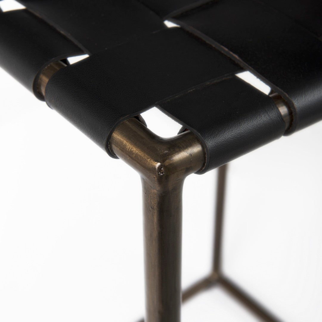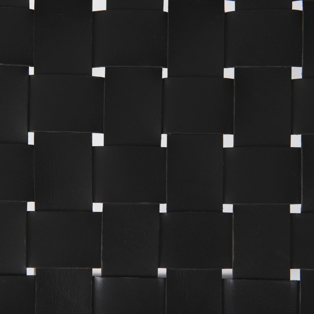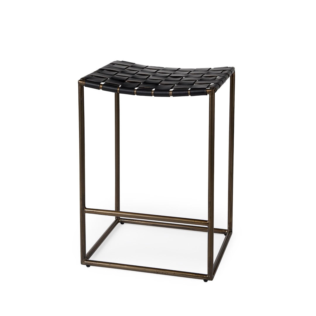 A stylish blend of industrial strength and handcrafted detail, this counter stool brings durable support and distinctive visual texture to kitchens, bars, or casual dining spaces. The Clarissa features a woven dark brown leather seat set on a matte black iron frame, offering a compact yet comfortable seating option that complements modern and industrial interiors.