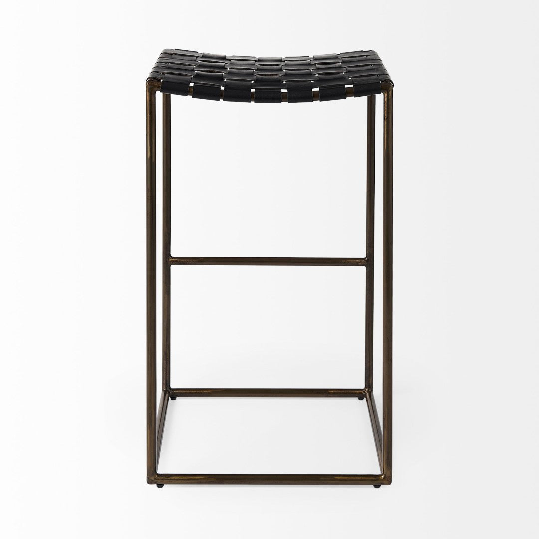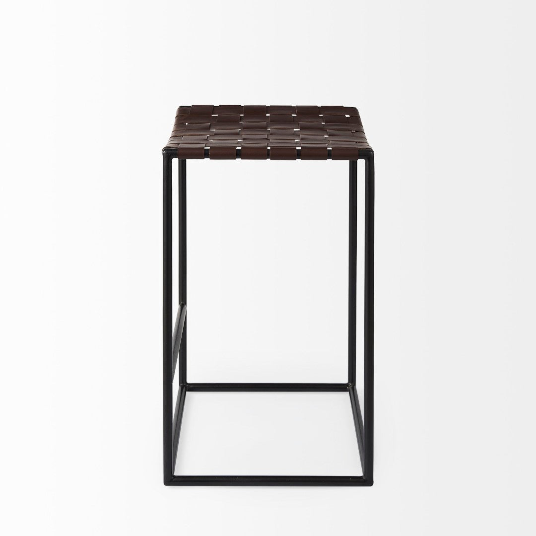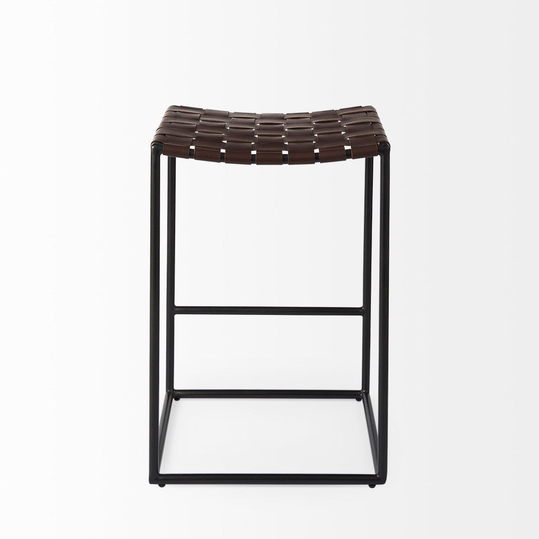 - The Clarissa is finished with solid black iron legs and a dark brown leather seat that shows off a unique woven formation.