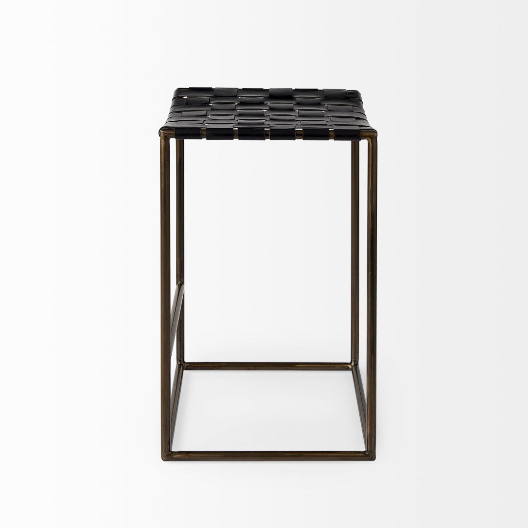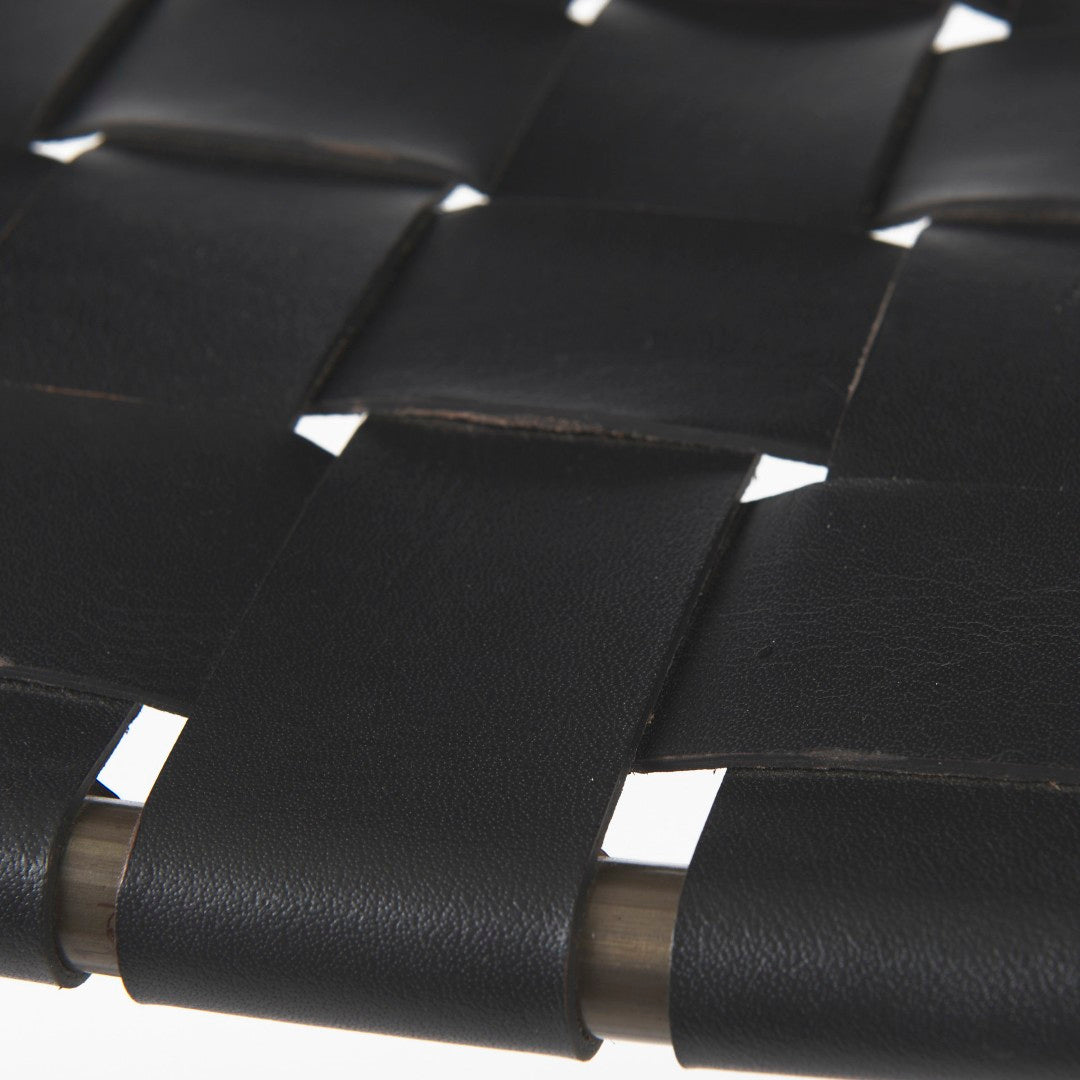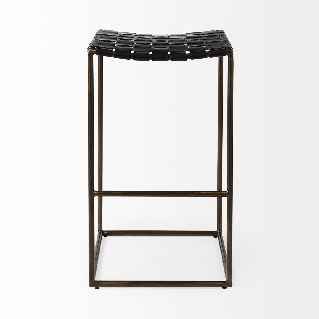 - The Clarissa is finished with solid black iron legs and a dark brown leather seat that shows off a unique woven formation.
