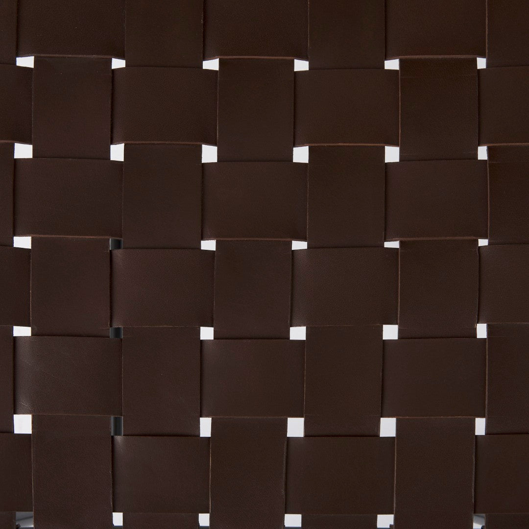 - Seat: Dark brown woven leather seat providing tactile interest and comfortable seating