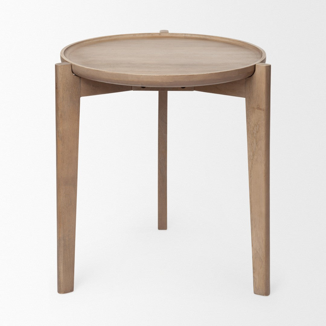 - This accent table is made entirely from solid Mango wood. It has a round top with a lipped edge that rests snuggly atop three straight legs.
