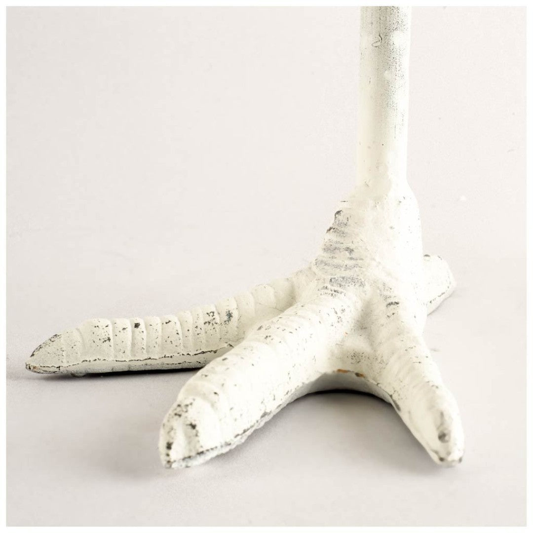 Bring a playful yet refined accent to your tabletop with this sculptural cast iron candle holder shaped like a chicken foot. Finished in a crisp white tone, it combines durability with whimsical design to create a conversation-starting piece that suits eclectic, global curiosities, farmhouse, or woodland-inspired interiors. Delivered ready to display, it’s ideal for styling mantels, side tables, entry consoles, or dining centerpieces (candles not included).