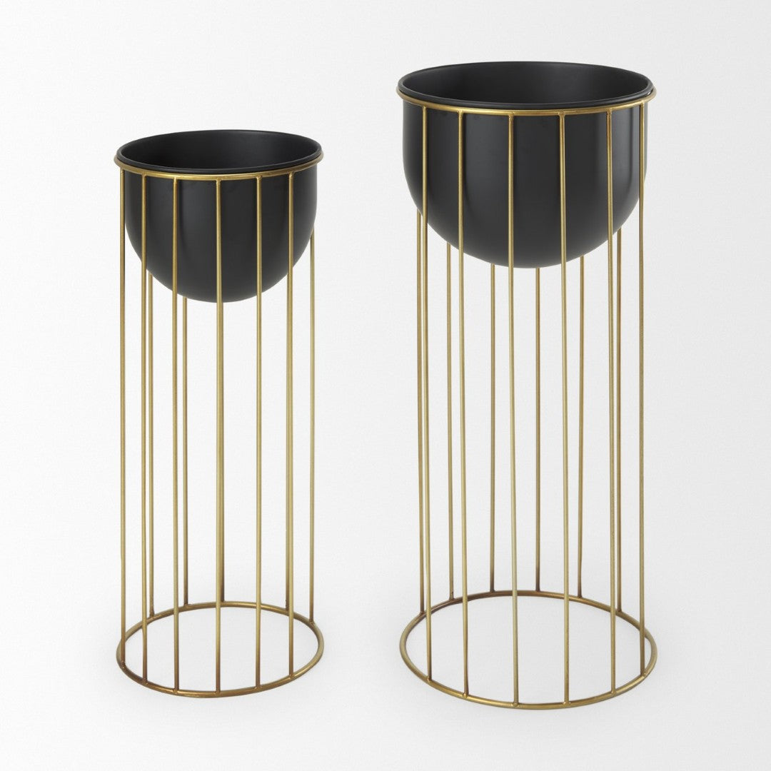 Elevate your indoor greenery with this coordinated set of two modern plant stands that blend minimalist form with luxe accents. Each piece pairs a matte black planter with a slender iron pedestal finished in gold, creating a striking contrast that complements contemporary, industrial, and glam interiors. Designed for easy styling together or separately, these stands bring height, presence, and polished finish to entryways, living rooms, or patios.