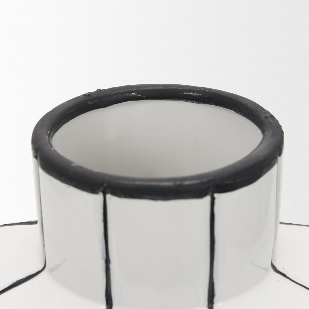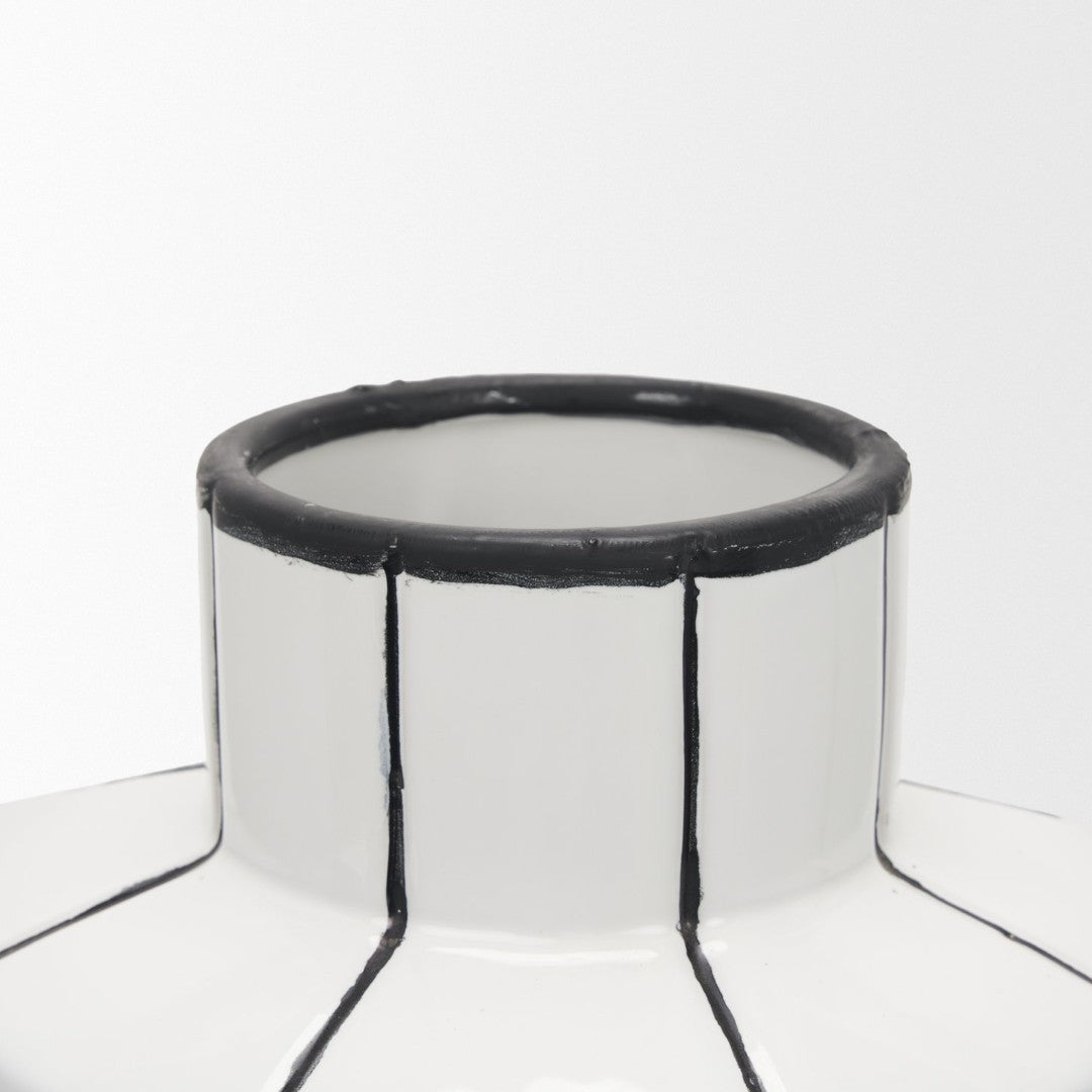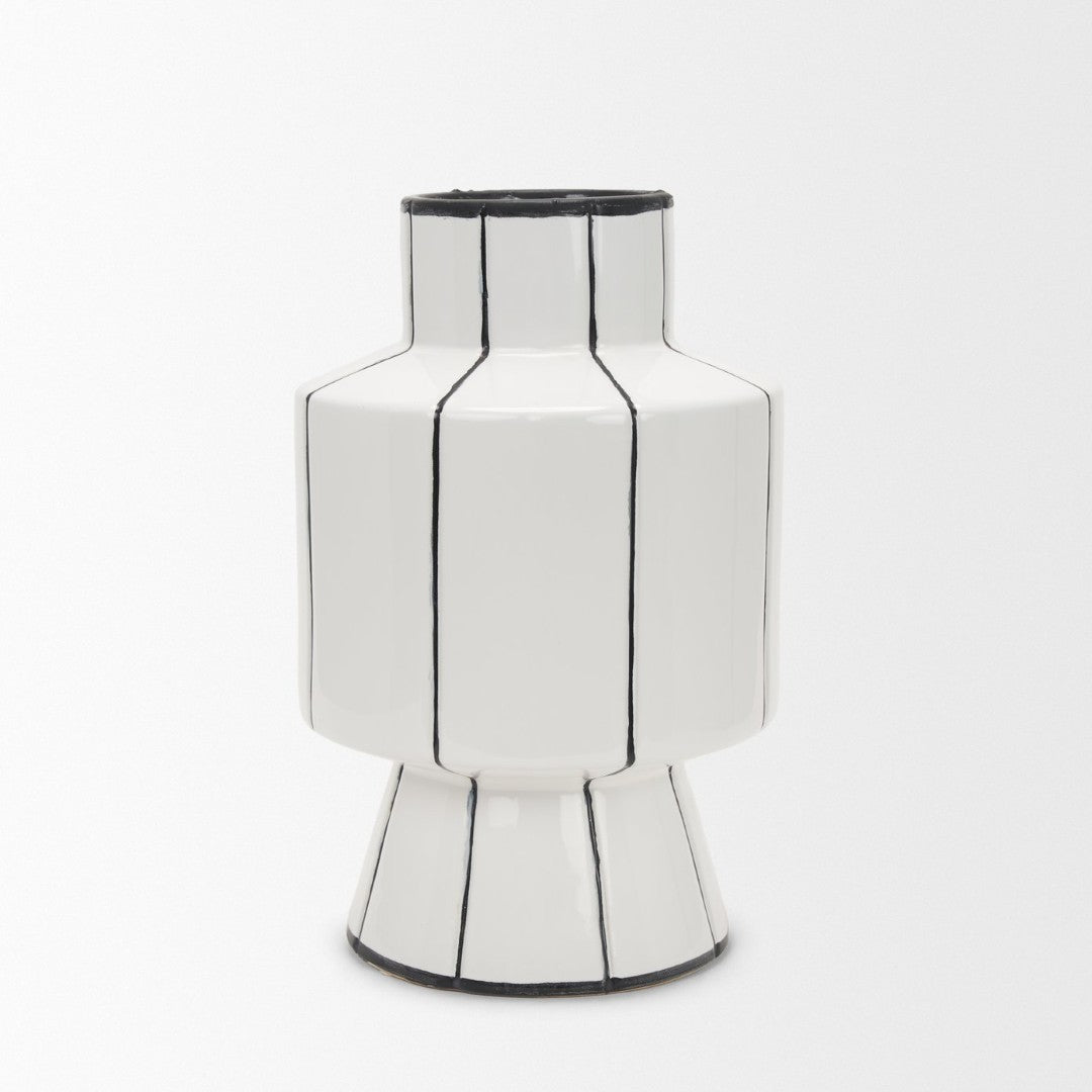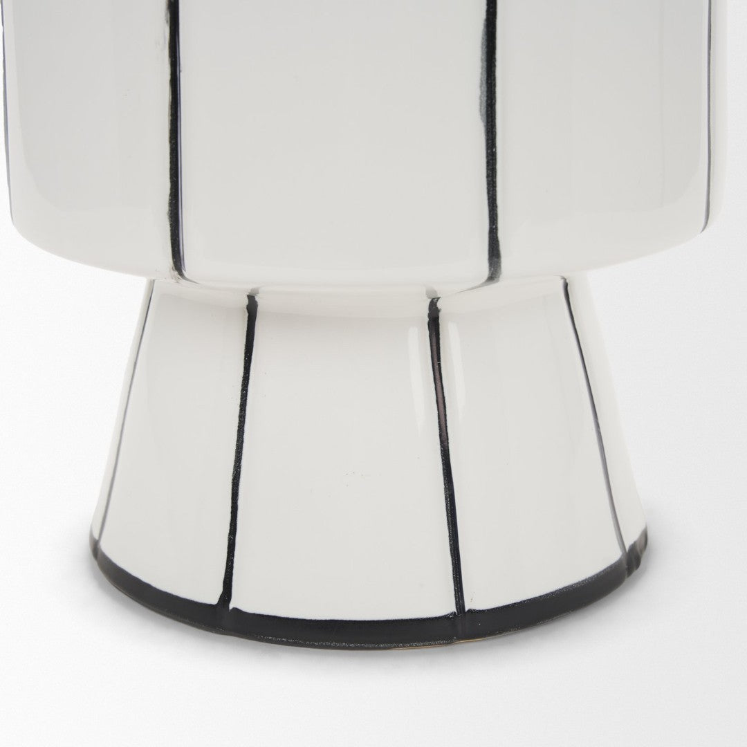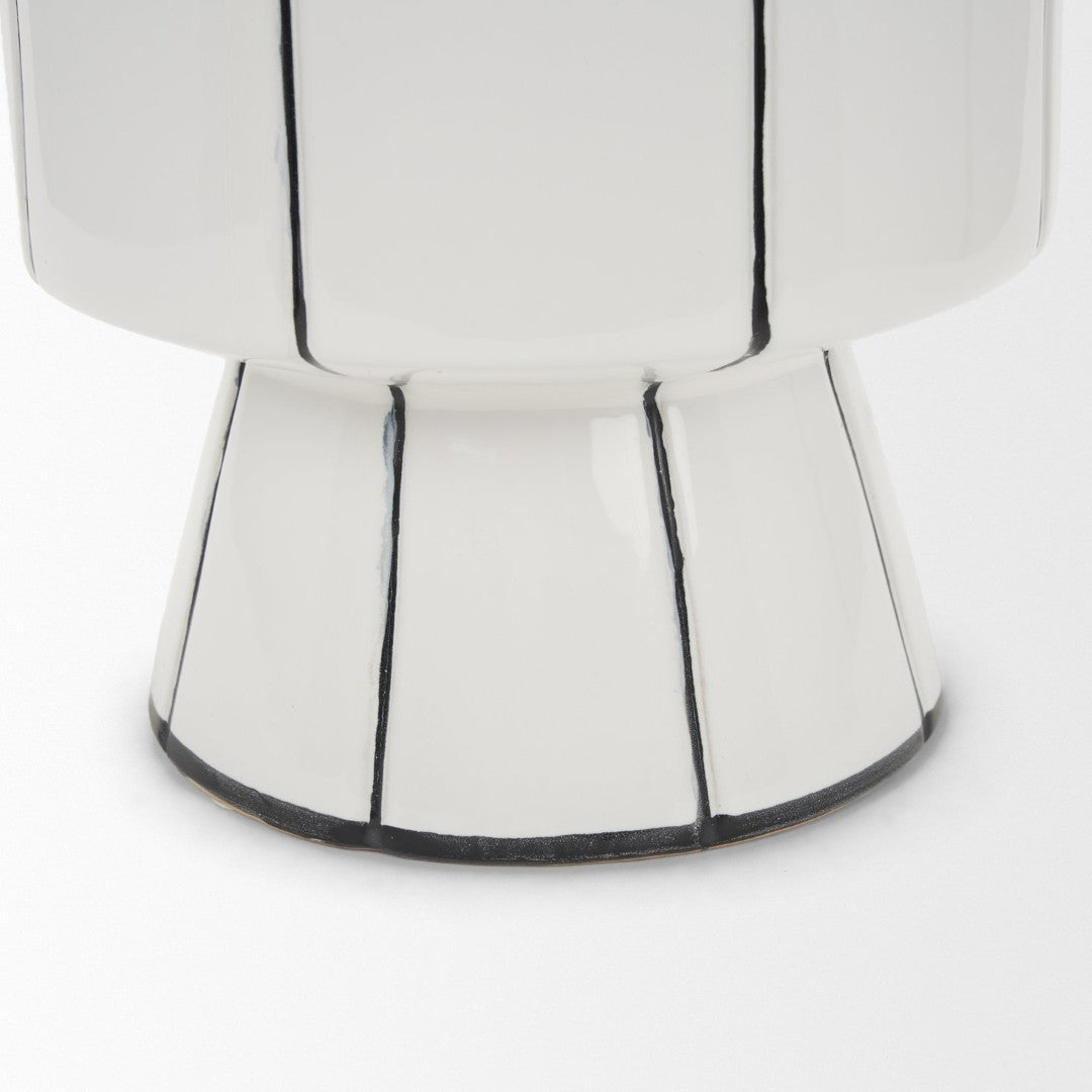 Elegant and modern, this small ceramic vase pairs a clean white gloss with striking hand-painted black vertical stripes for a contemporary accent that suits both fresh florals and standalone display. Its compact silhouette and watertight construction make it a versatile piece for tabletops, shelves, or mantels—each vase has subtle variations from the hand-painted finish, giving every item a unique character.