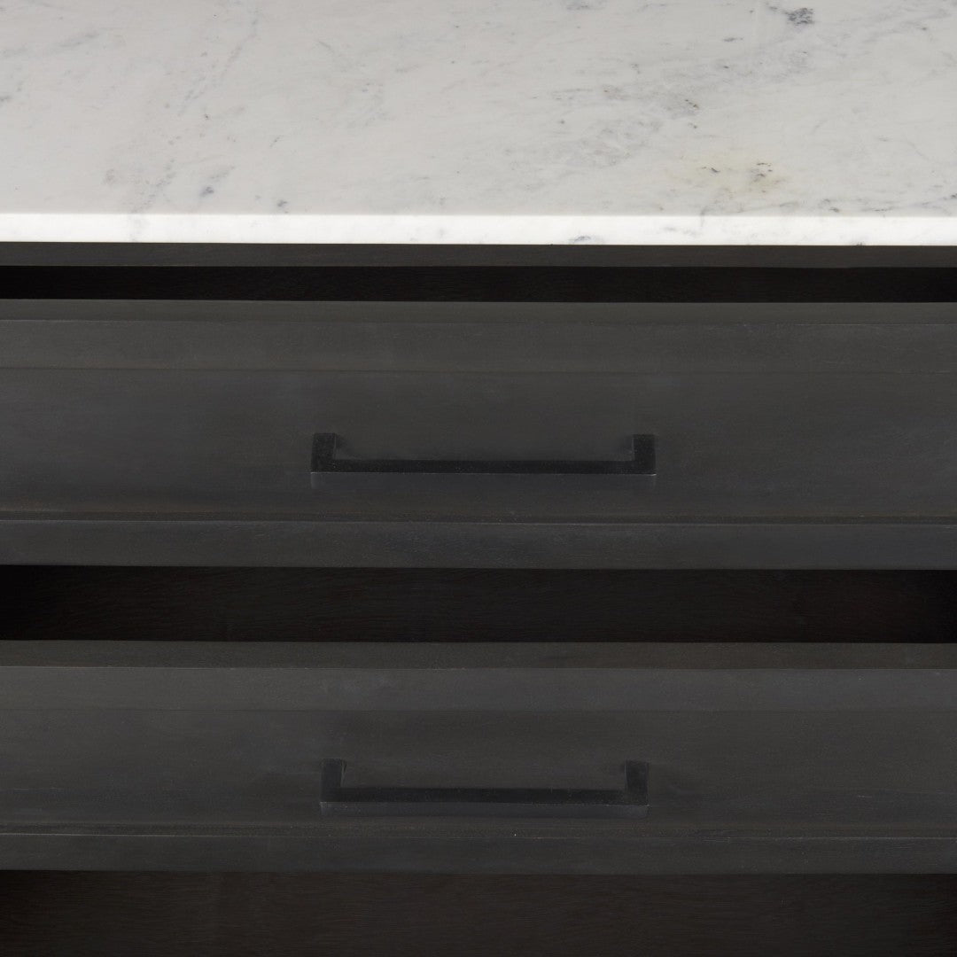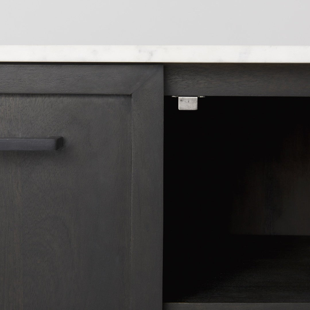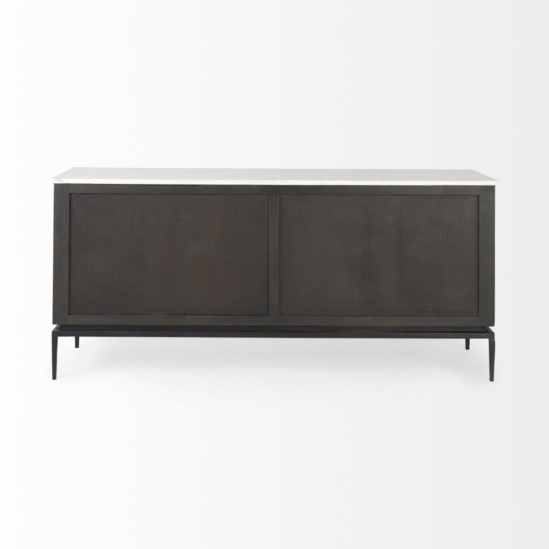 Elevate your dining or living area with this striking sideboard that blends natural materials and modern design. Handcrafted from solid mango wood with a textured black-brown finish, a genuine white marble top, and a sturdy black iron base, it delivers both visual warmth and lasting durability. Ideal for storing dinnerware, linens, or media essentials, the piece pairs decorative appeal with practical organization.