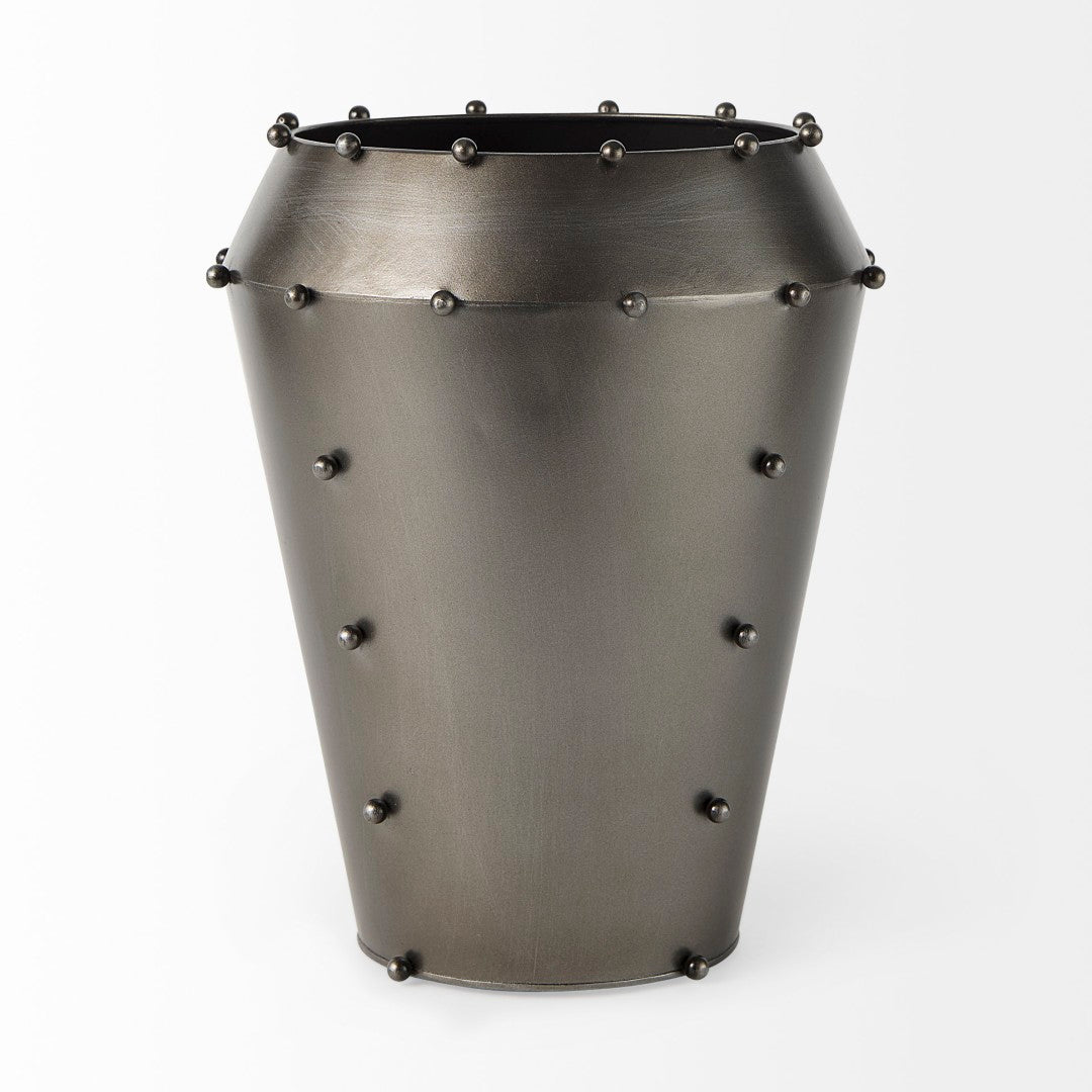 - This unique vase is finished in a gun metal gray tone, and features interesting metal studs running down the sides, and around the opening.