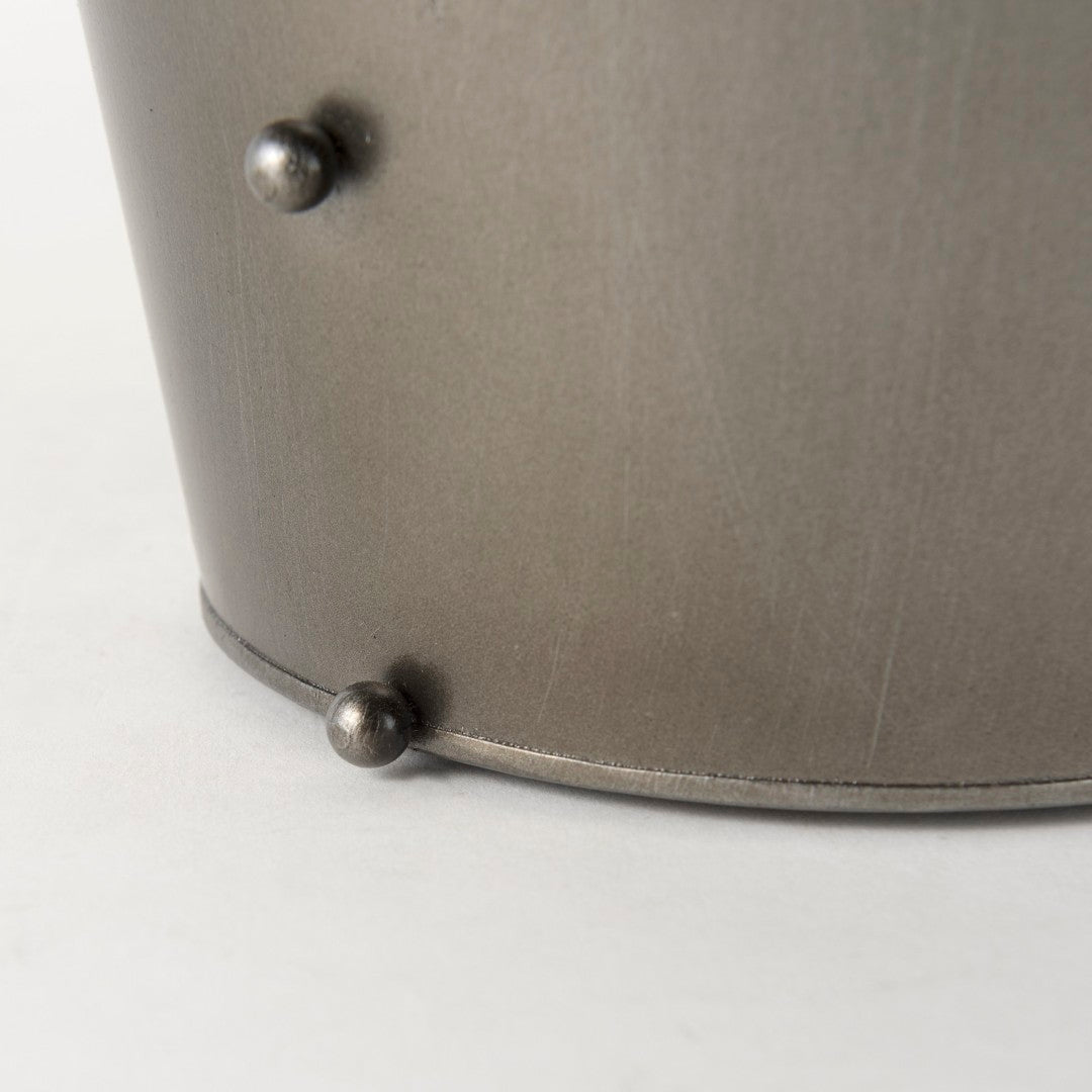 Elegant and edgy, this Elio metal vase combines industrial strength with decorative detail to create a striking accent for modern and transitional interiors. The gun metal gray finish and distinctive studded trim give the piece visual weight while its all-metal construction ensures lasting durability—perfect for displaying dried arrangements, sculptural stems, or standing alone as a statement object.