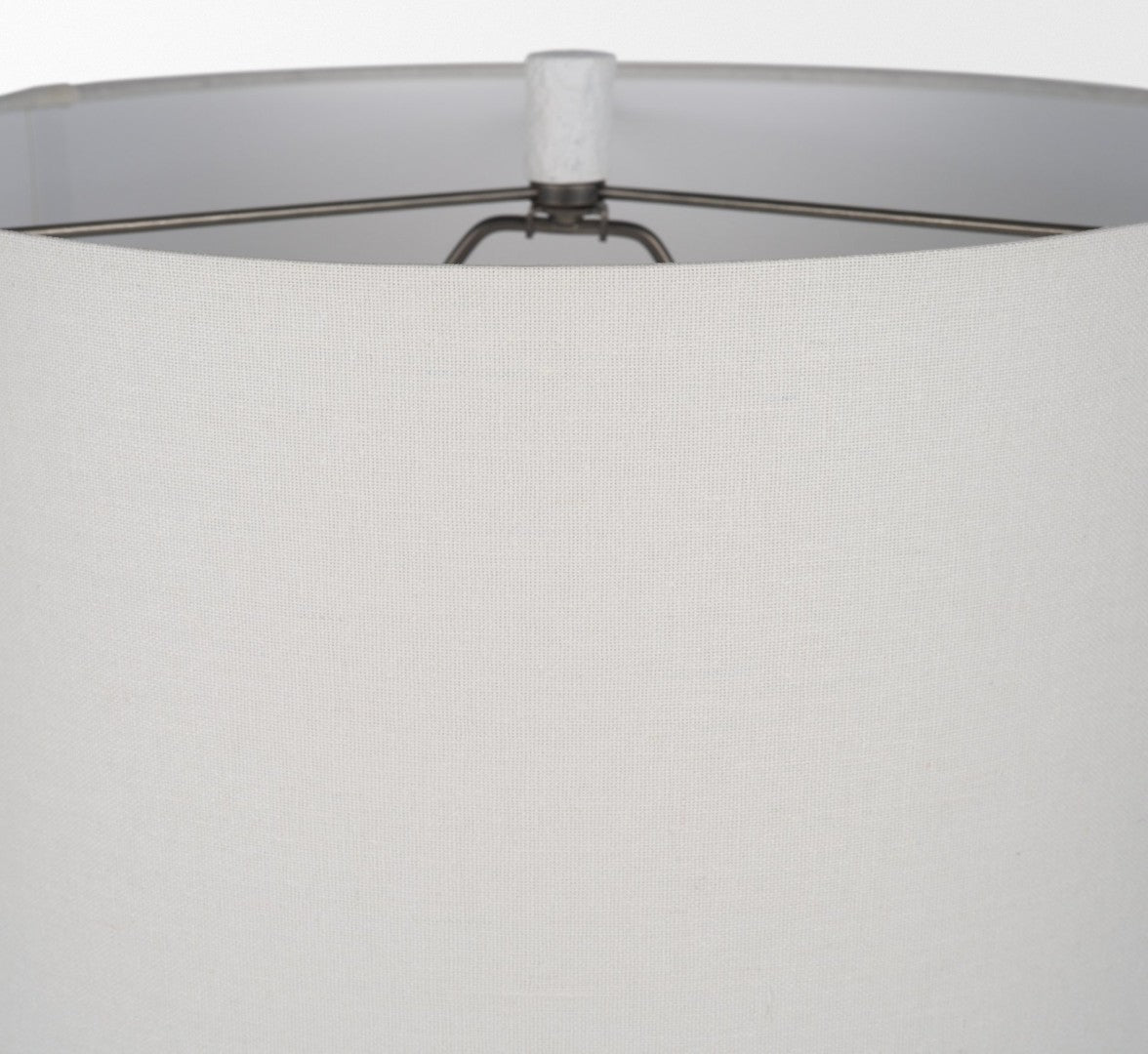 - Materials: Main material — concrete (textured matte white finish); shade — soft beige fabric