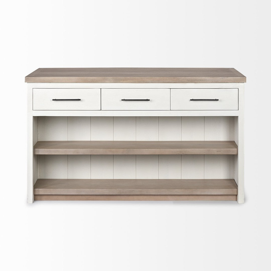 Bring farmhouse charm and practical storage to your kitchen with this solid wood two-tone island. The Fairview II pairs a painted white base with a warm light-brown mango wood top for a clean, classic look that works in Farmhouse, American, Colonial, or French Country interiors. Thoughtfully designed with shelves, drawers, and metal hardware, it provides accessible organization while serving as a durable working countertop and focal point for meal prep and entertaining.