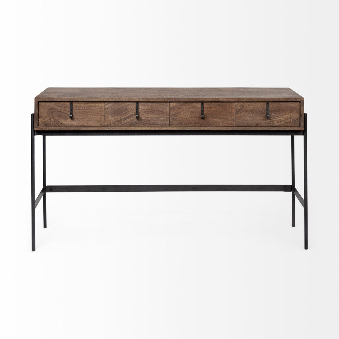 - The Glenn III console table, finished in a two-tone palette with a black metal frame and a medium brown chassis, is expertly crafted from solid wood and iron components. This makes for a sturdy and substantial addition to your space which is built to stand the test of time.