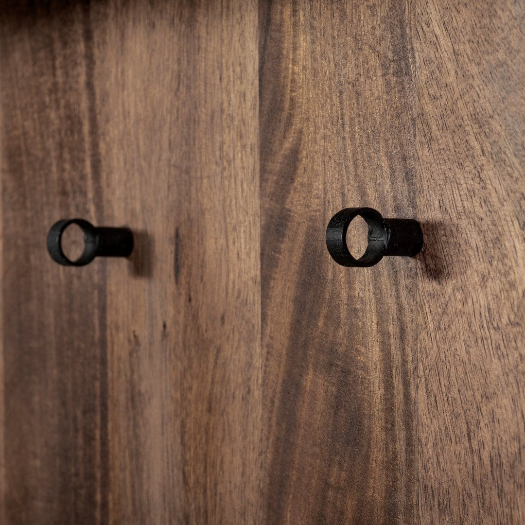 - The Glenn V hall tree, expertly crafted from solid wood and iron components is built to stand the test of time. Finished in a two-tone palette with a black metal frame and a medium brown chassis, the Glenn V is sure to stand out in any space and setting.