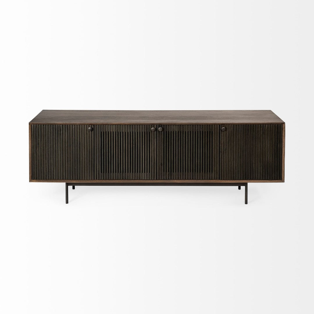 - The four doors on this exquisite media cabinet don an intricate, shutter-inspired pattern that makes it the perfect piece for any modern space.