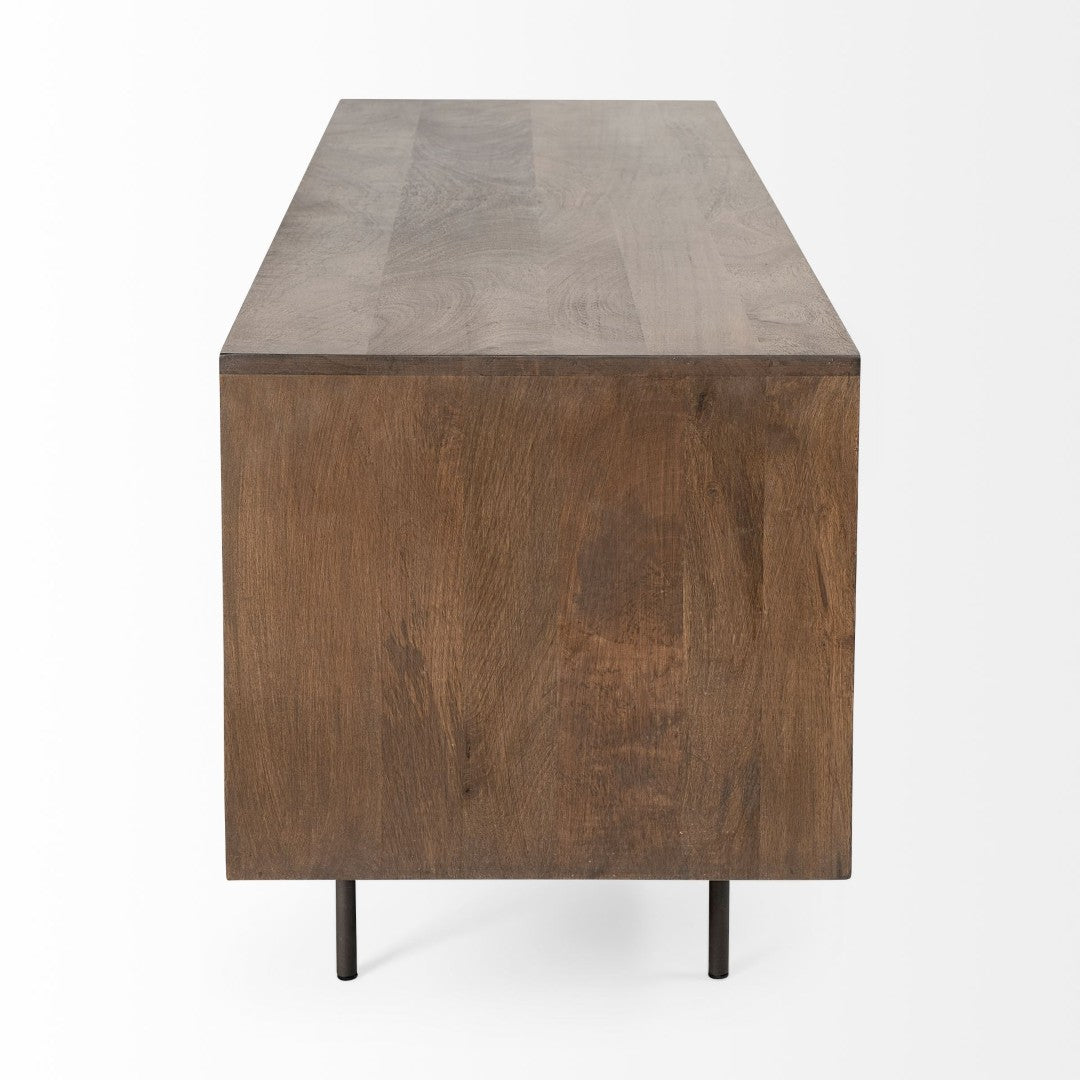 Bring warmth and timeless style to your living room with this two-toned solid wood media console. Expertly crafted from premium Indian mango wood, it blends mid-century and global influences with practical features—ample storage, soft-closing doors, and a large top surface that accommodates most TVs—so your entertainment area looks organized and refined without sacrificing durability.