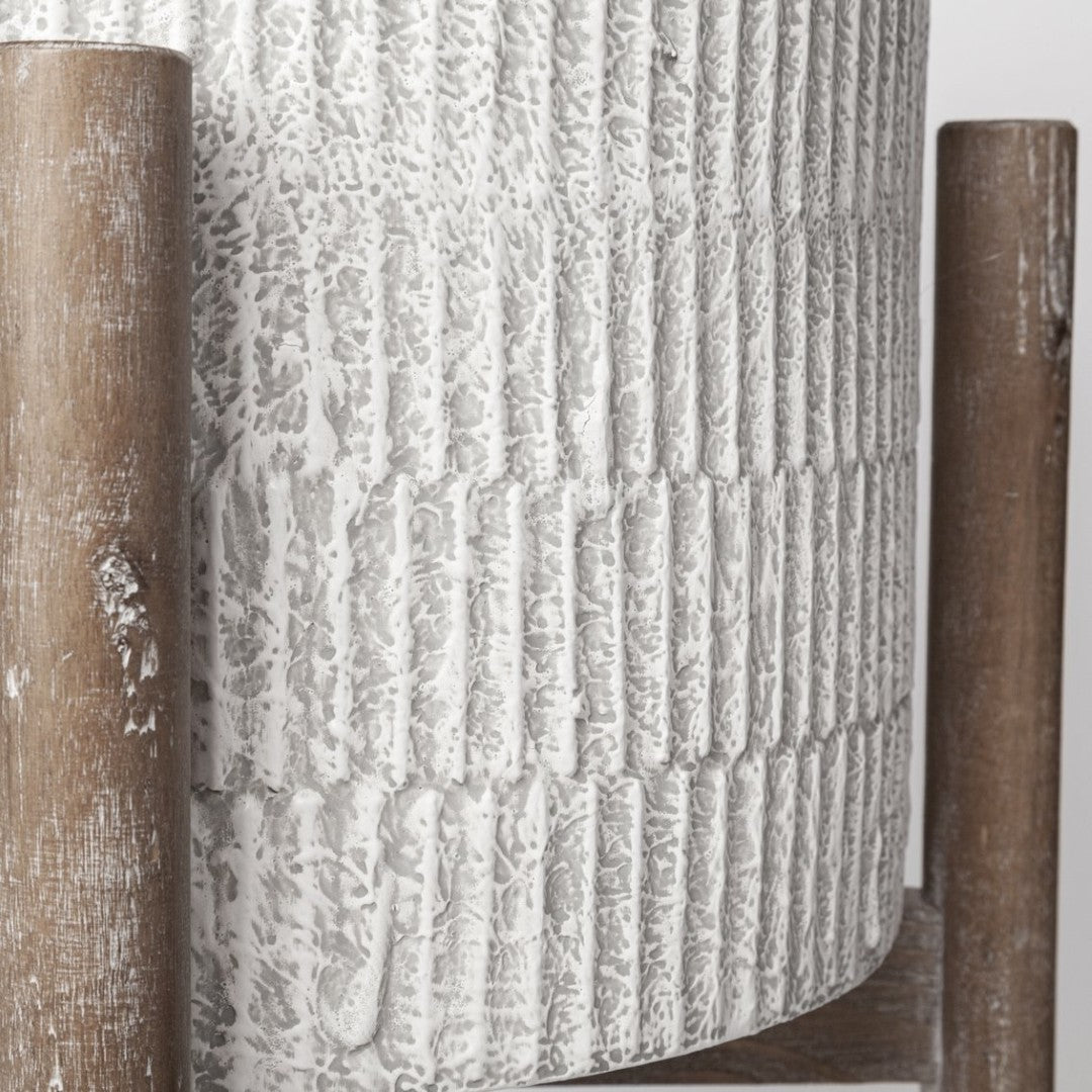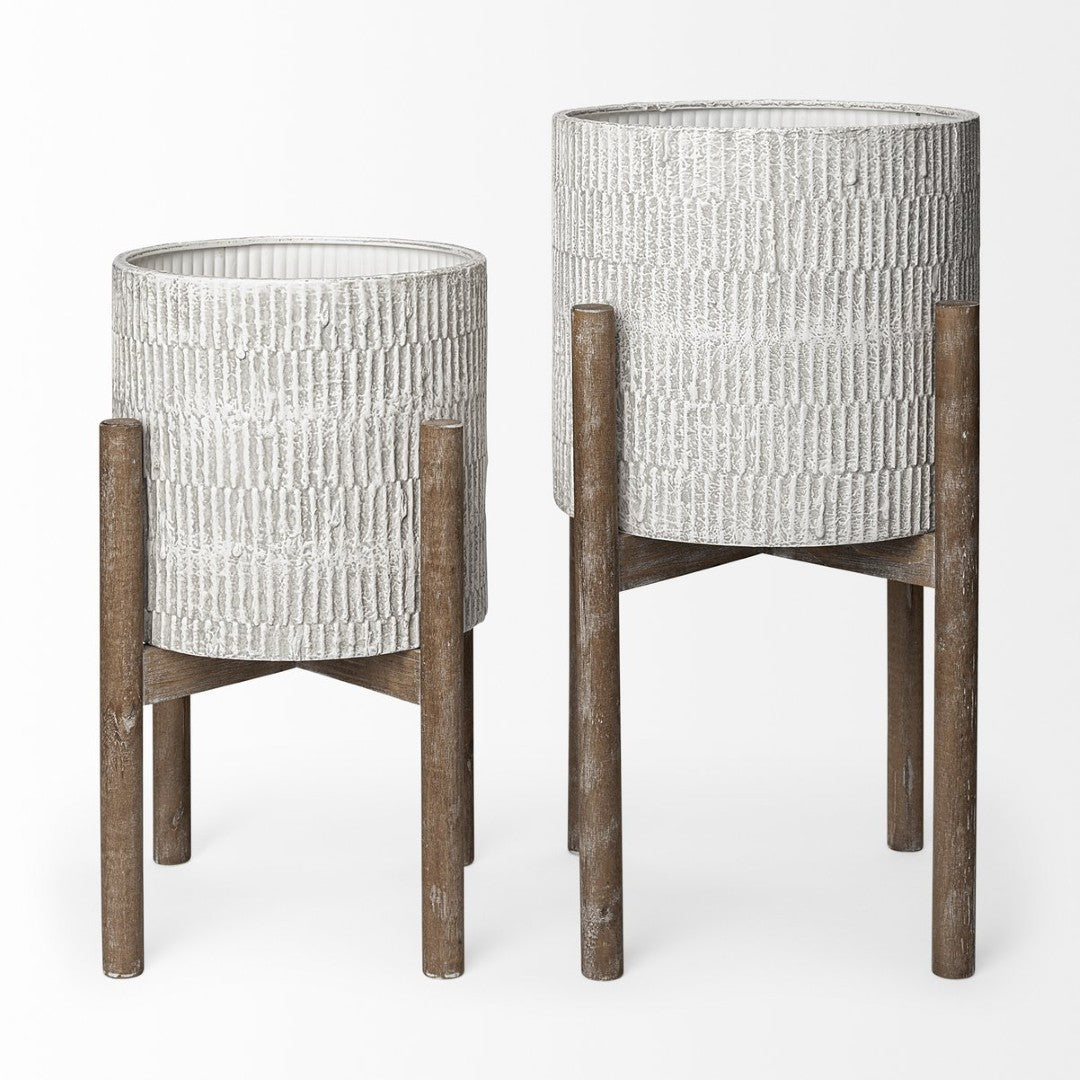 Bring natural texture and modern flair to your home with the Groot set of two plant stands. Finished in a soft eggshell tone with a warm wooden base, these stands elevate potted plants while complementing Mid‑Century Modern, Relaxed Modern, Tropical, Coastal, or Nautical interiors. Durable ceramic (metal-toned) cylinders and sturdy wooden supports deliver reliable function and a refined aesthetic—arriving pre-assembled for immediate styling.