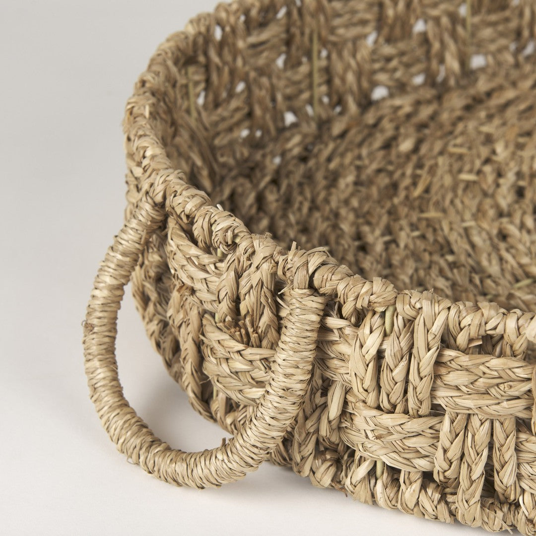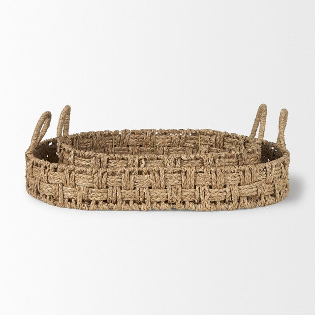Elevate your home organization and tabletop styling with this elegant set of two handwoven seagrass trays. Crafted for durability and natural charm, these oval basketweave trays combine rustic texture with practical loop handles—perfect for serving, displaying décor, or corralling everyday essentials in any room.