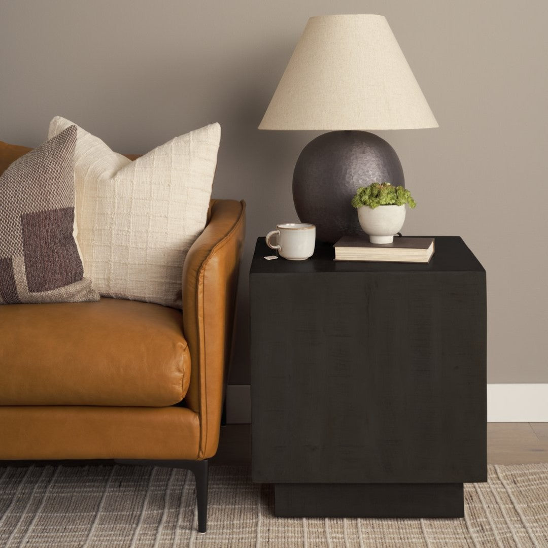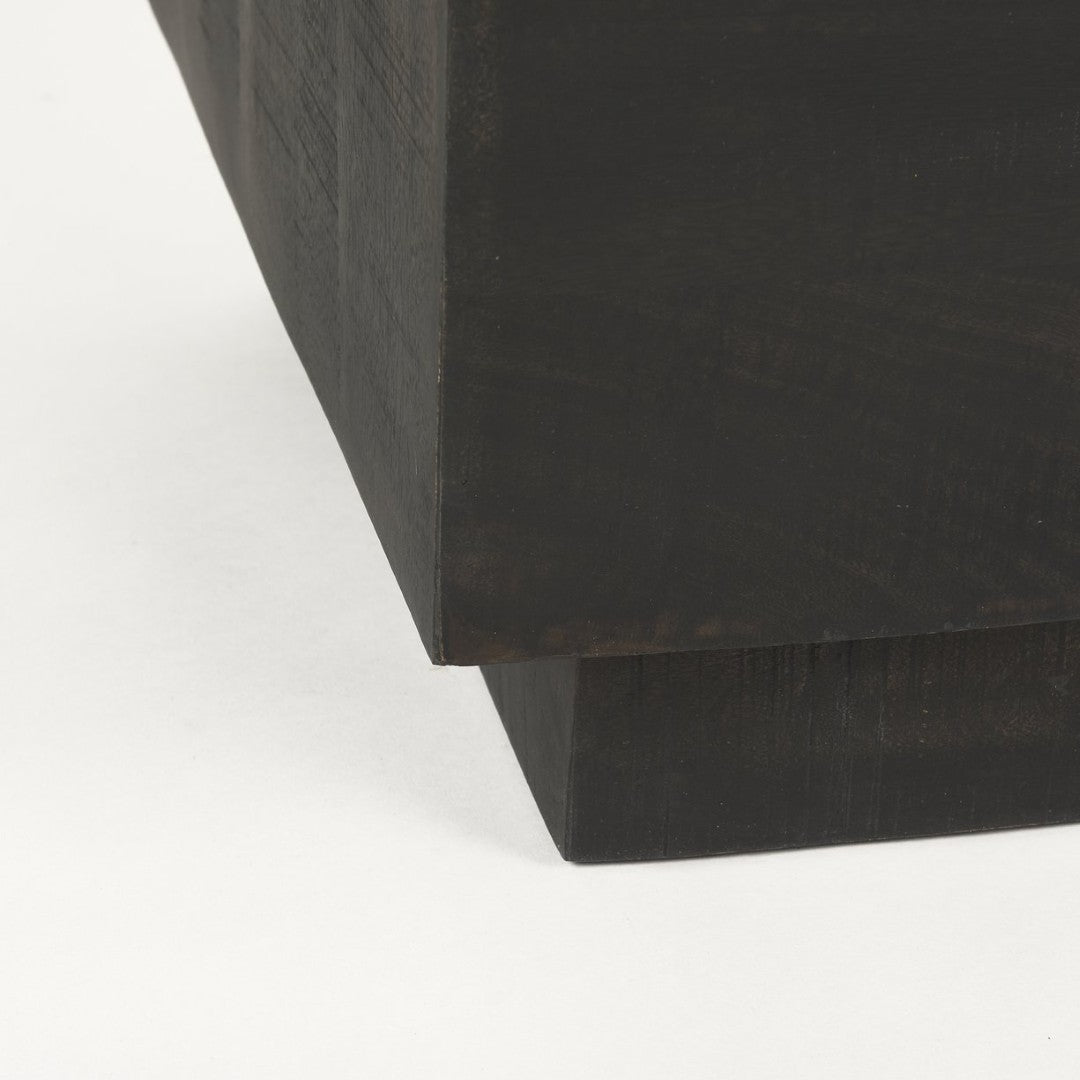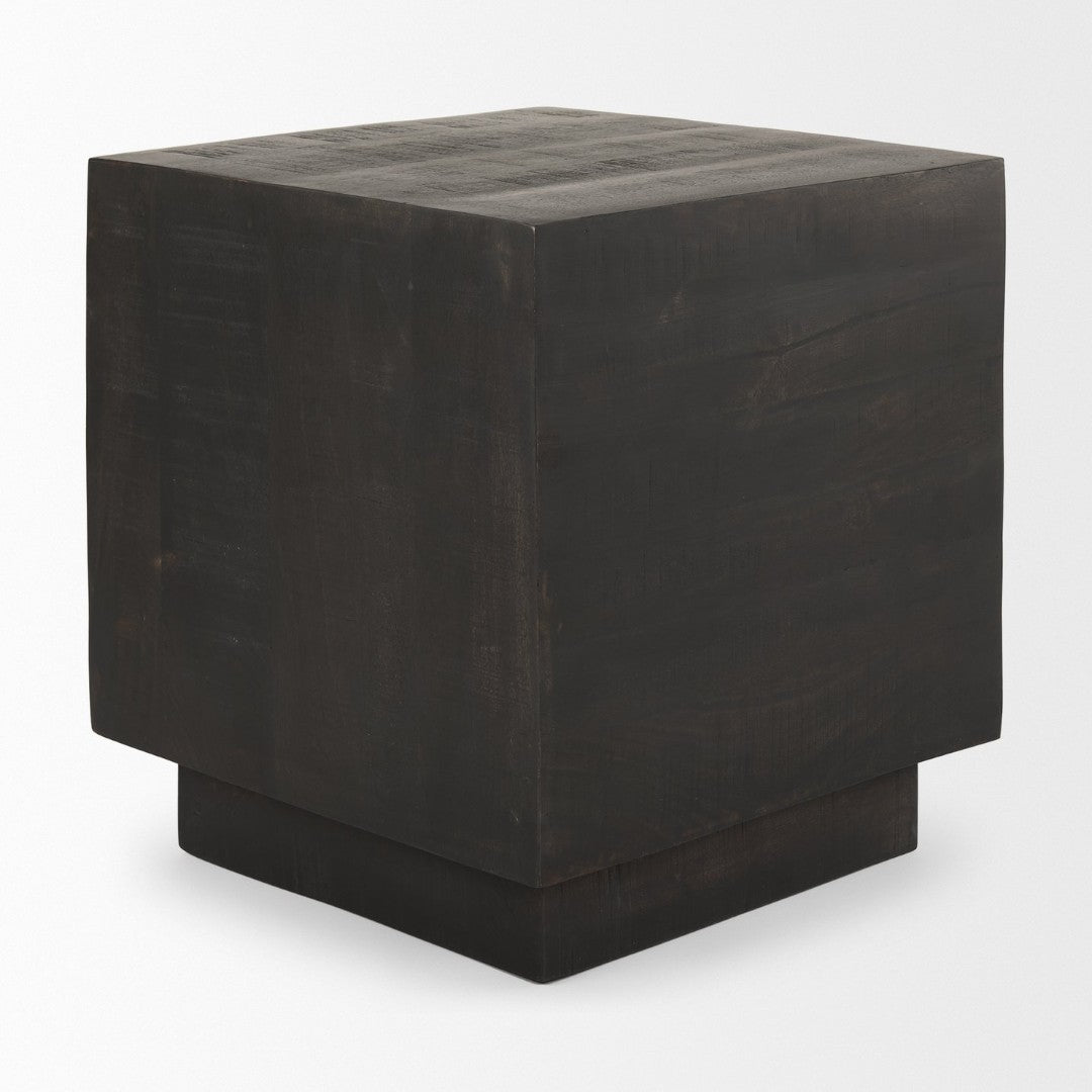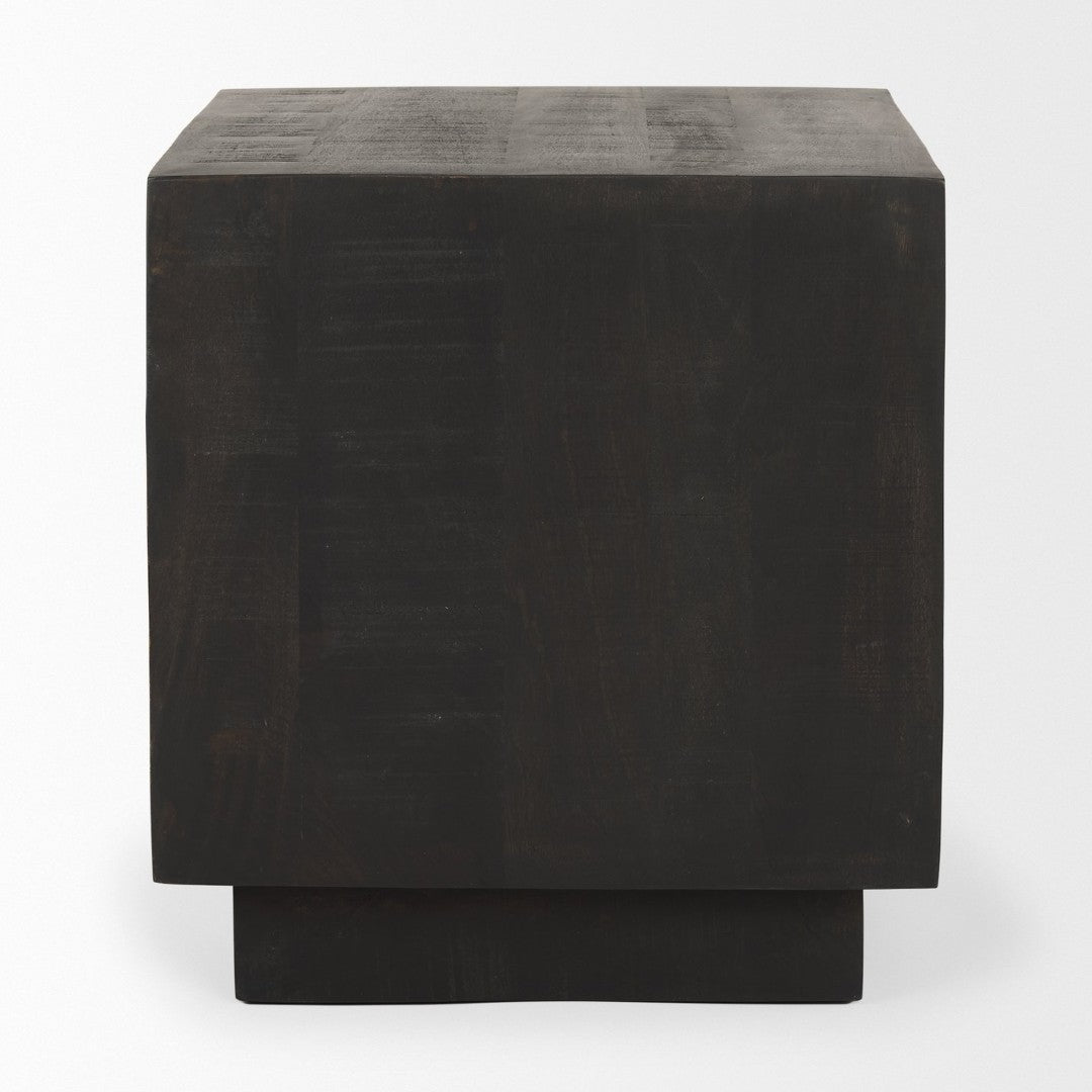 Elevate your living space with a minimalist yet striking end/side table that blends contemporary and rustic elements. Its clean, box-like silhouette and recessed base create a subtle floating effect, making it an ideal accent for modern, transitional, or farmhouse interiors. Crafted from solid wood with a deep dark brown finish, this table offers both form and function—perfect for holding a lamp, display items, or keeping essentials within reach.