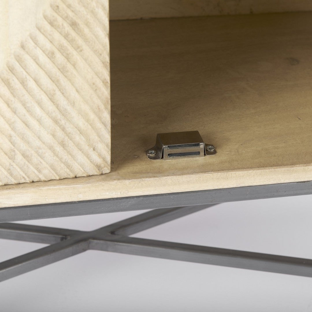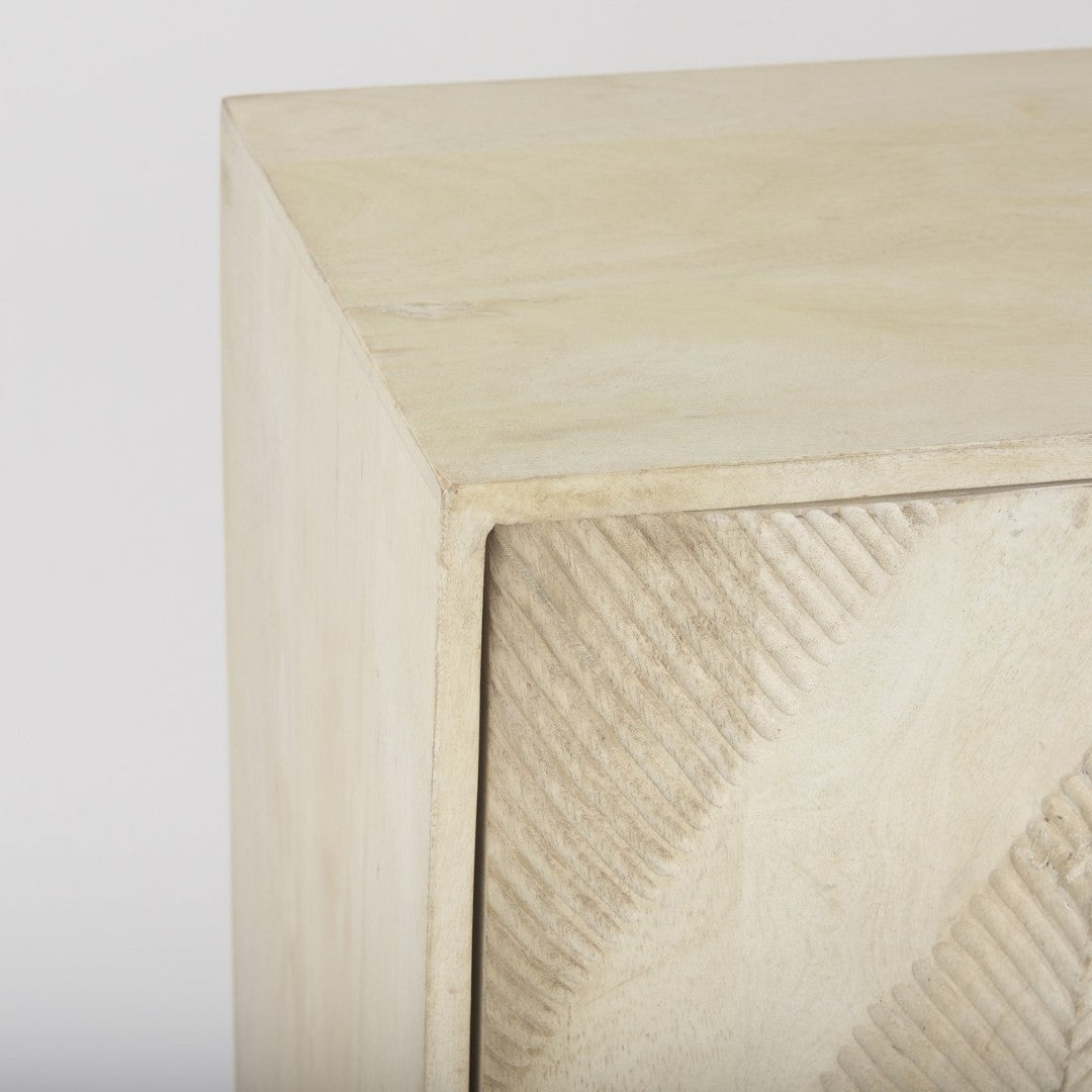- Design Details: Unique geometric pattern carved into the two doors with dimpled handles for tactile and visual appeal