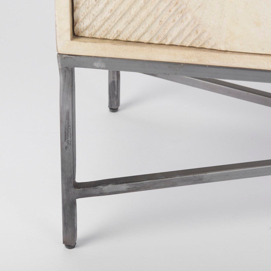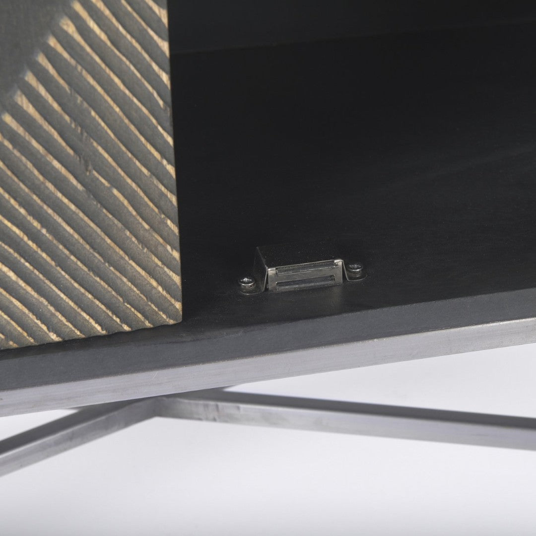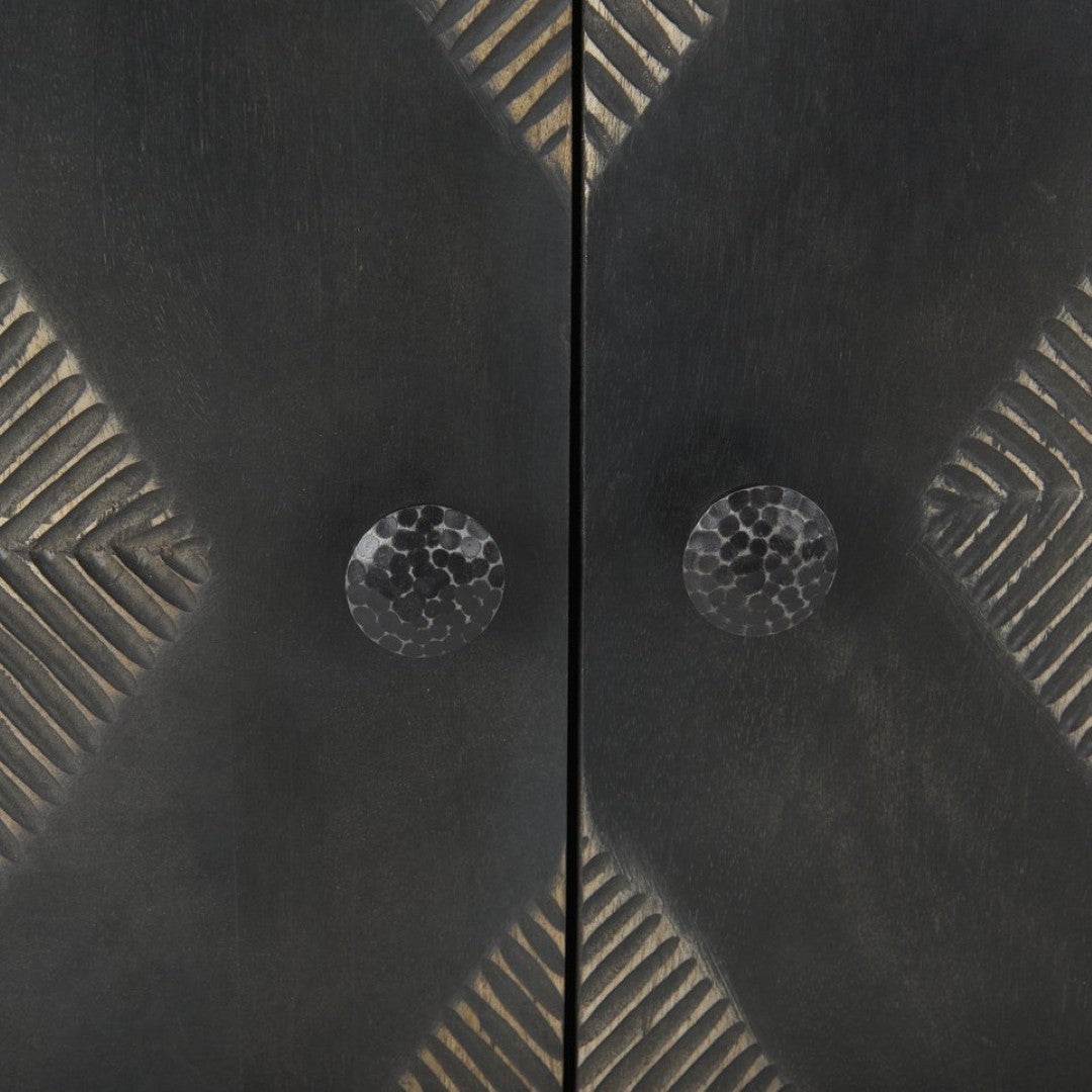 A striking balance of modern design and rustic warmth, this dark accent cabinet elevates any living space with its bold geometric door pattern and durable construction. Handcrafted from solid mango wood with an iron base, the cabinet offers both visual interest and long-lasting sturdiness—perfect for storing essentials while serving as a standout decorative piece.