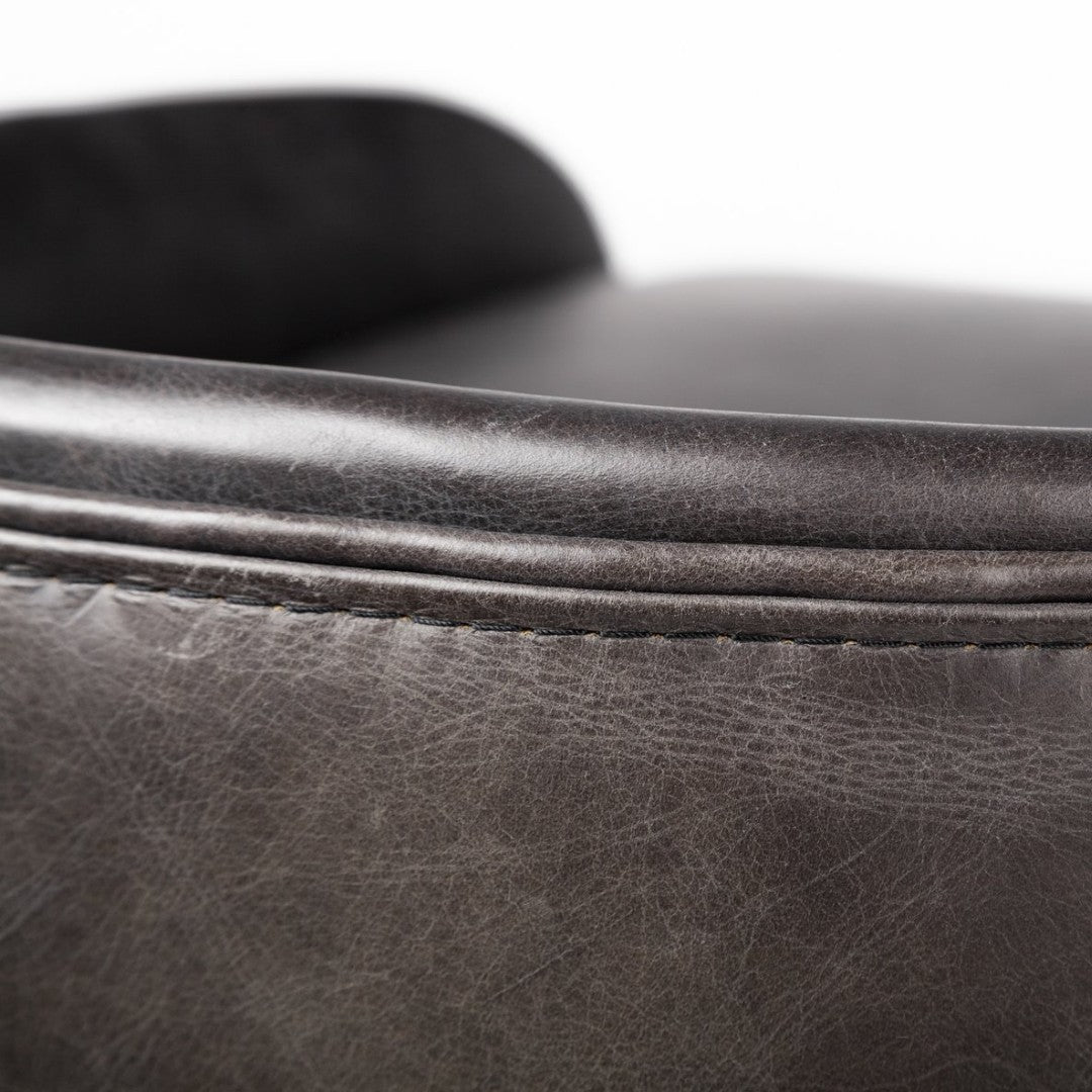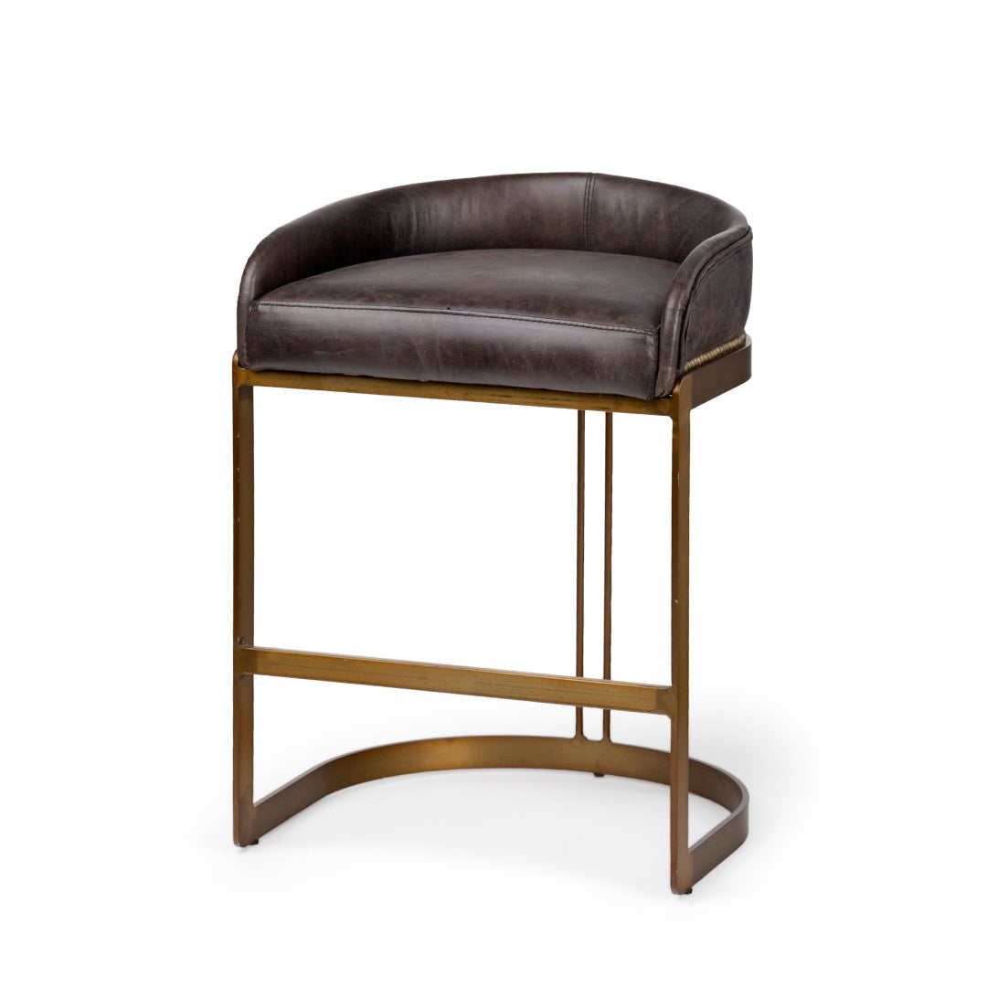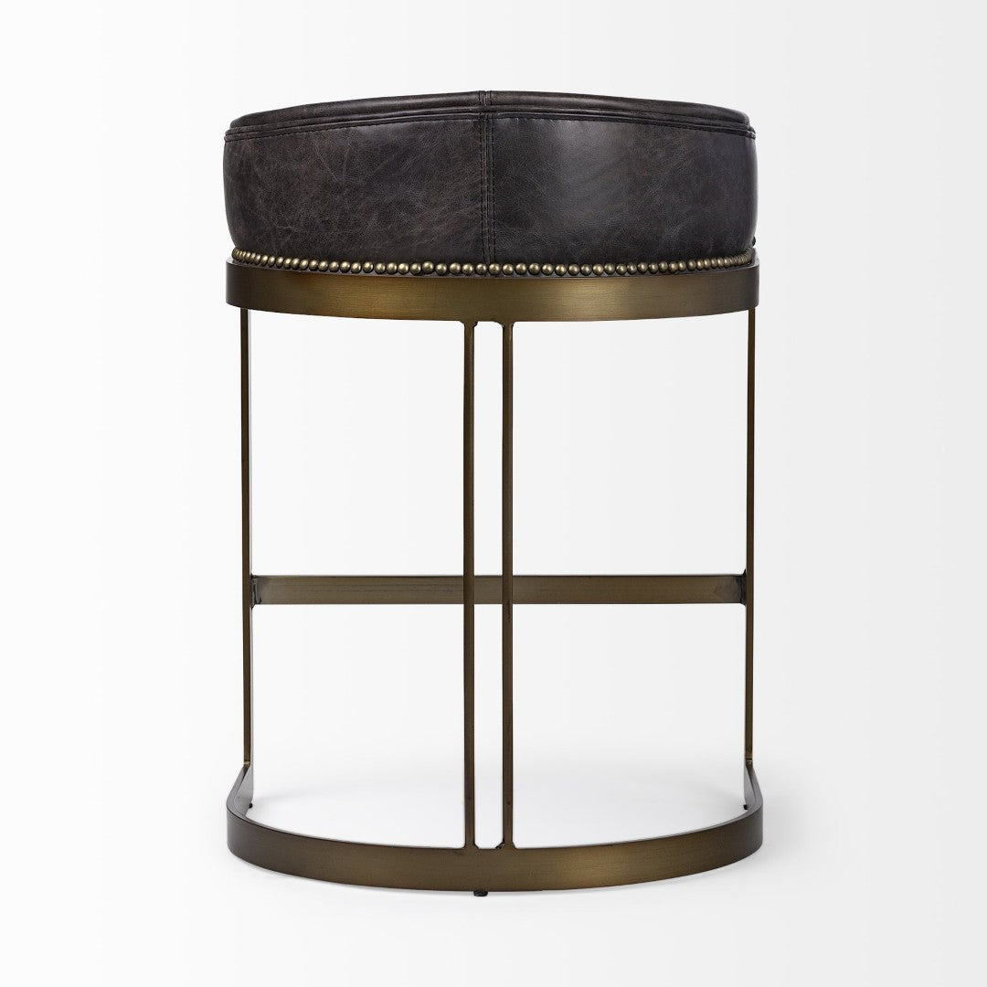 Luxurious yet versatile, this club-style counter stool combines plush black leather seating with a striking antiqued-gold metal base for a refined modern-industrial look. Its low-back design and generous cushioning offer comfortable support for kitchen counters, islands, or bar-height surfaces while the solid metal construction ensures lasting stability and everyday durability.