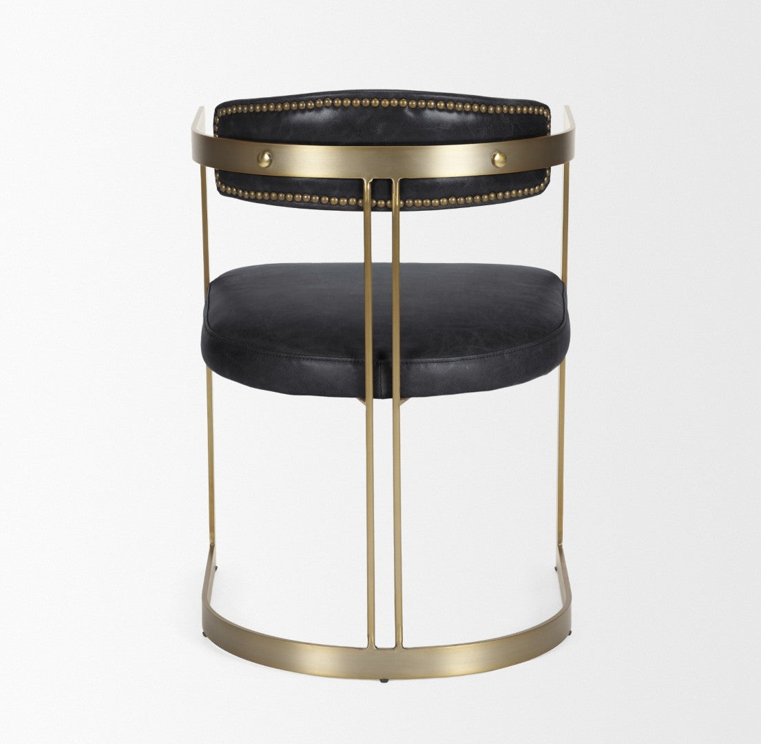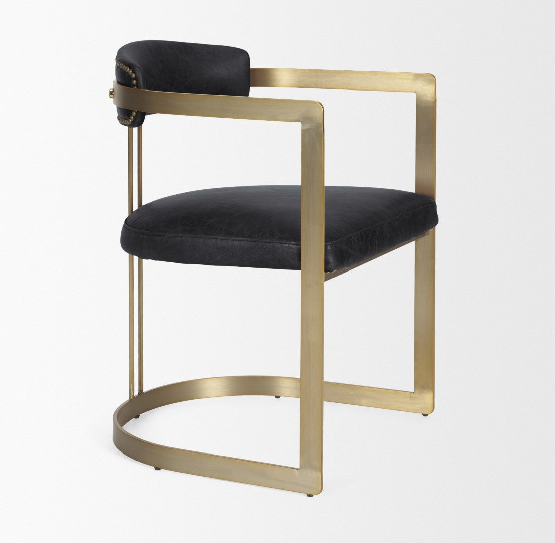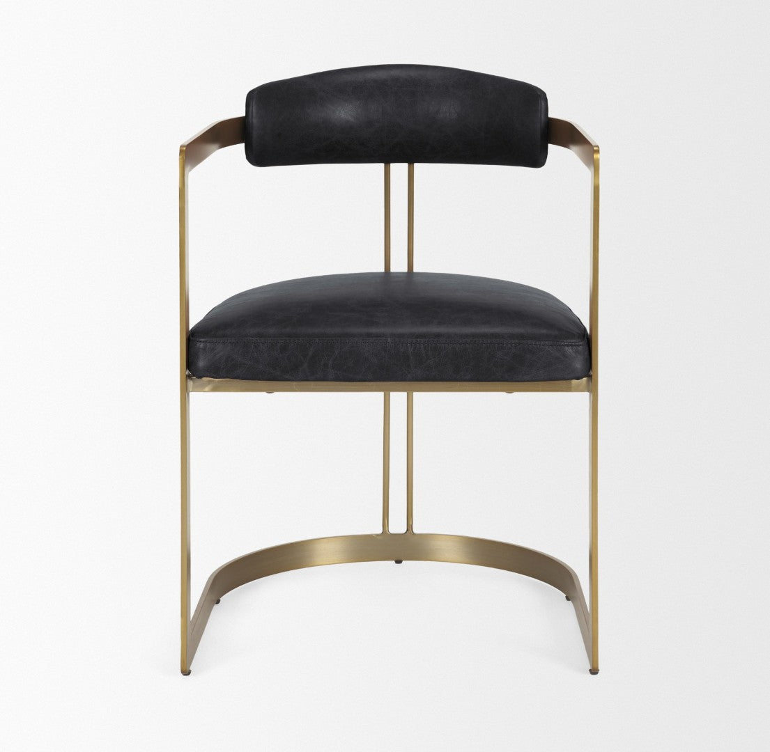 Make a striking statement at your dining table with a chair that pairs rich, top-grain antiqued ebony leather and a sculptural gold iron frame. The Hollyfield II balances luxurious materials and contract-grade construction with a curved, floating silhouette that reads light and elegant while providing durable, everyday performance. Ideal for upscale dining rooms, modern lofts, or as an accent seat, this design develops a beautiful patina over time and features refined, handcrafted details.