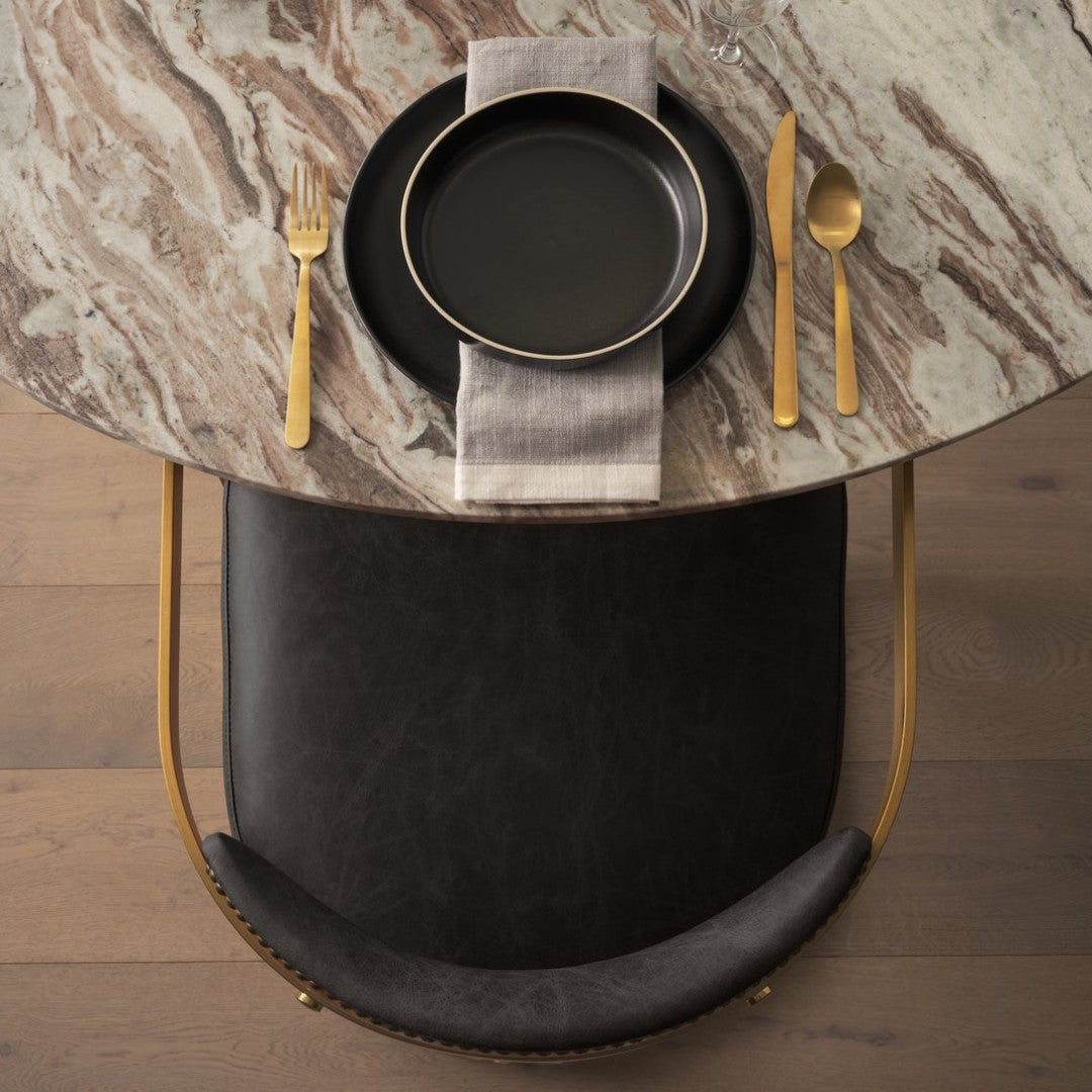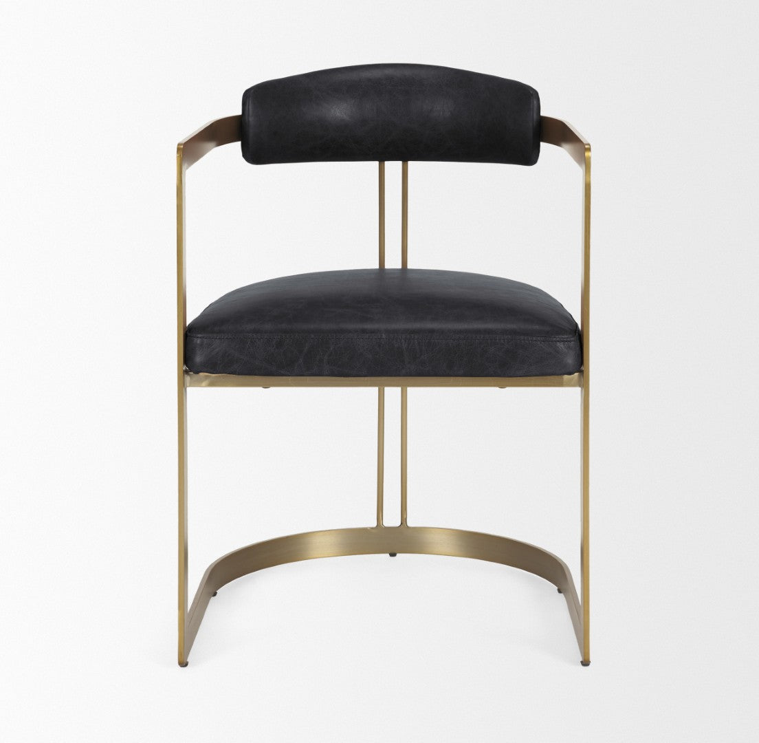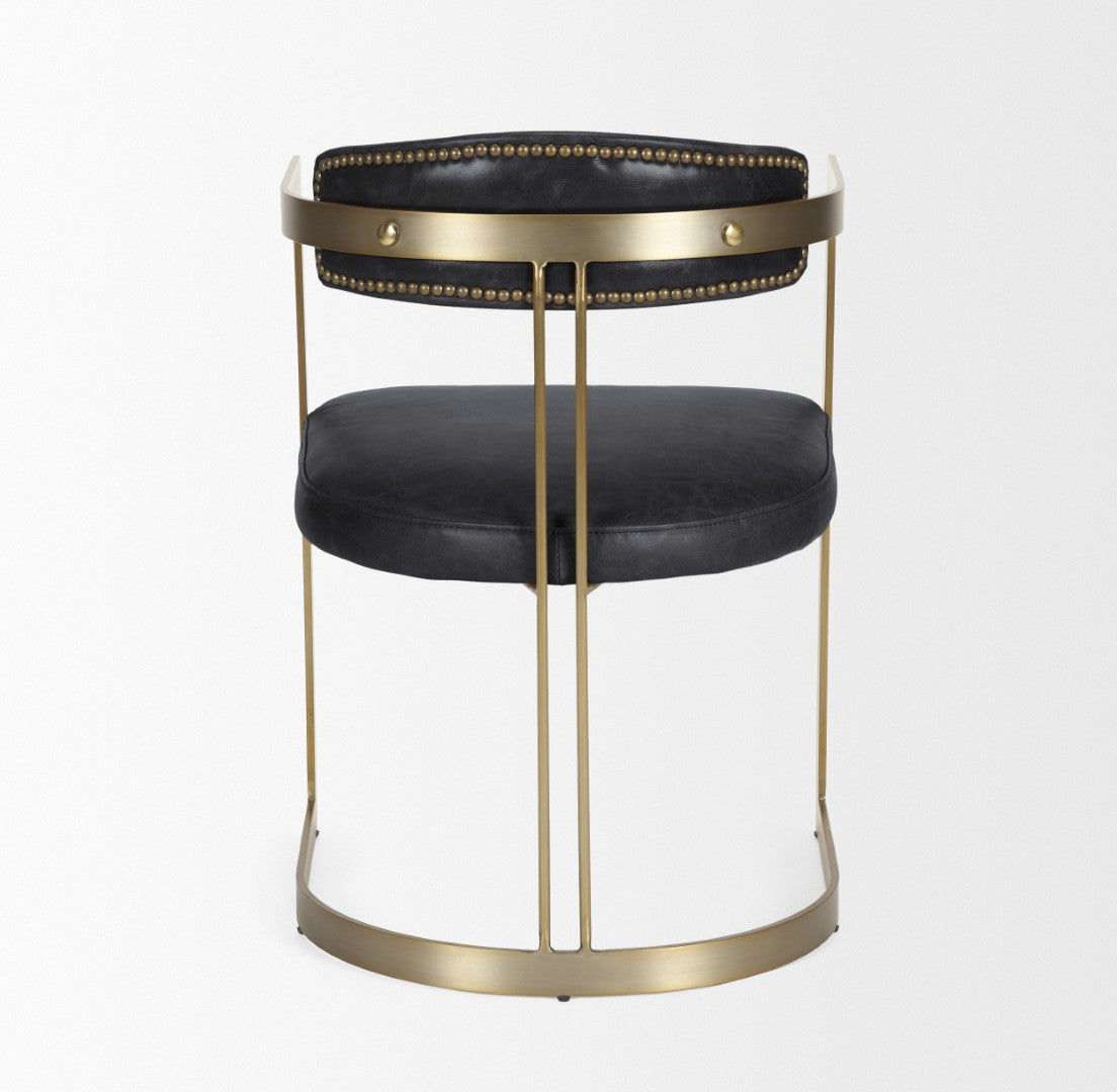 - Materials: Genuine top-grain antiqued ebony leather upholstery; contract-grade gold iron frame for structural strength and sculptural elegance