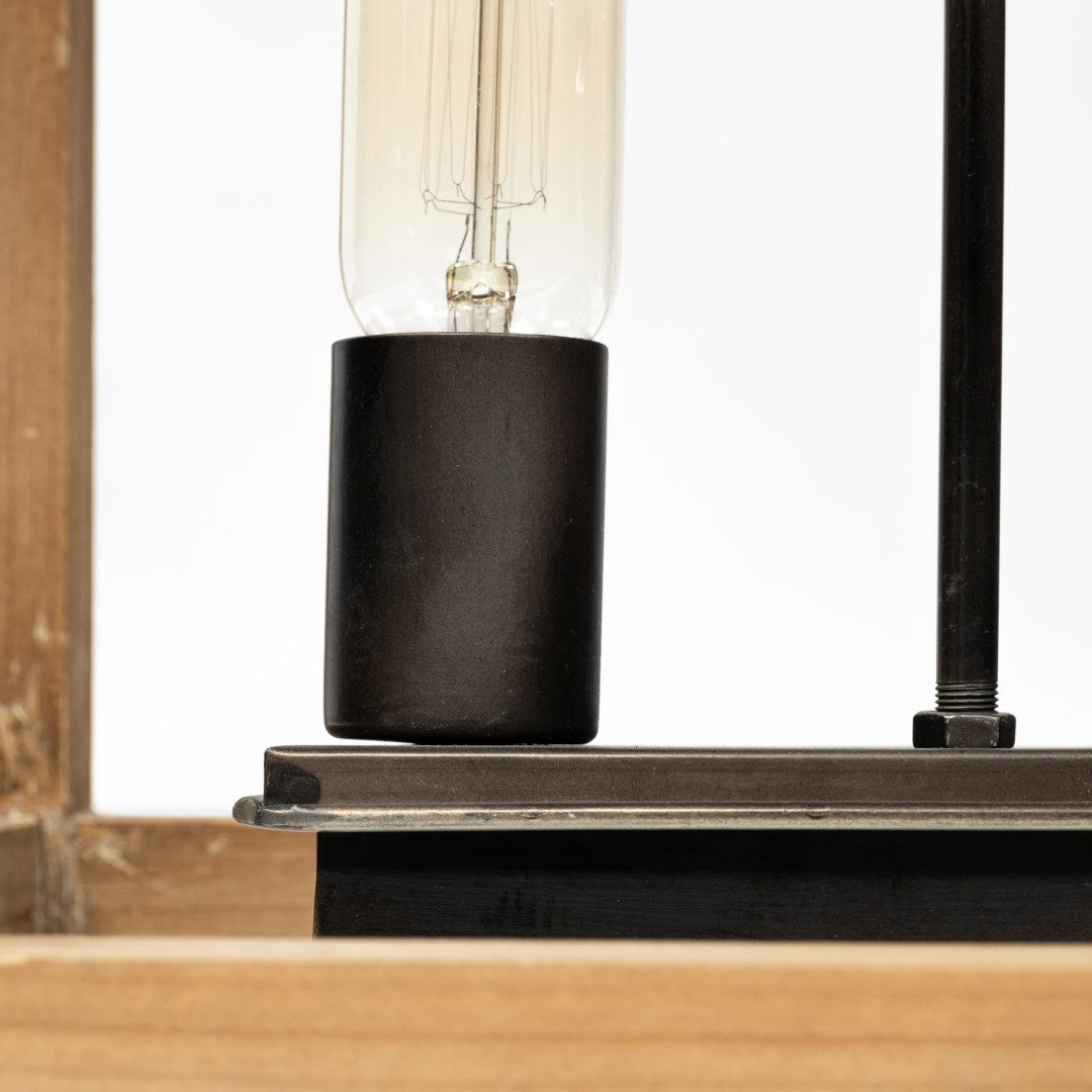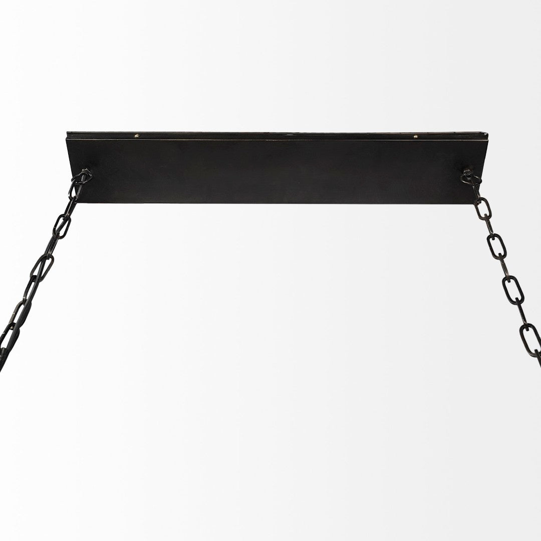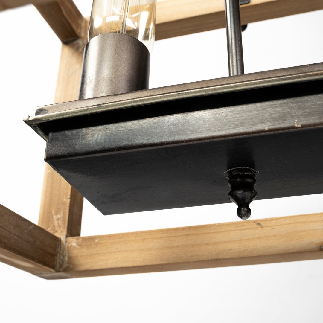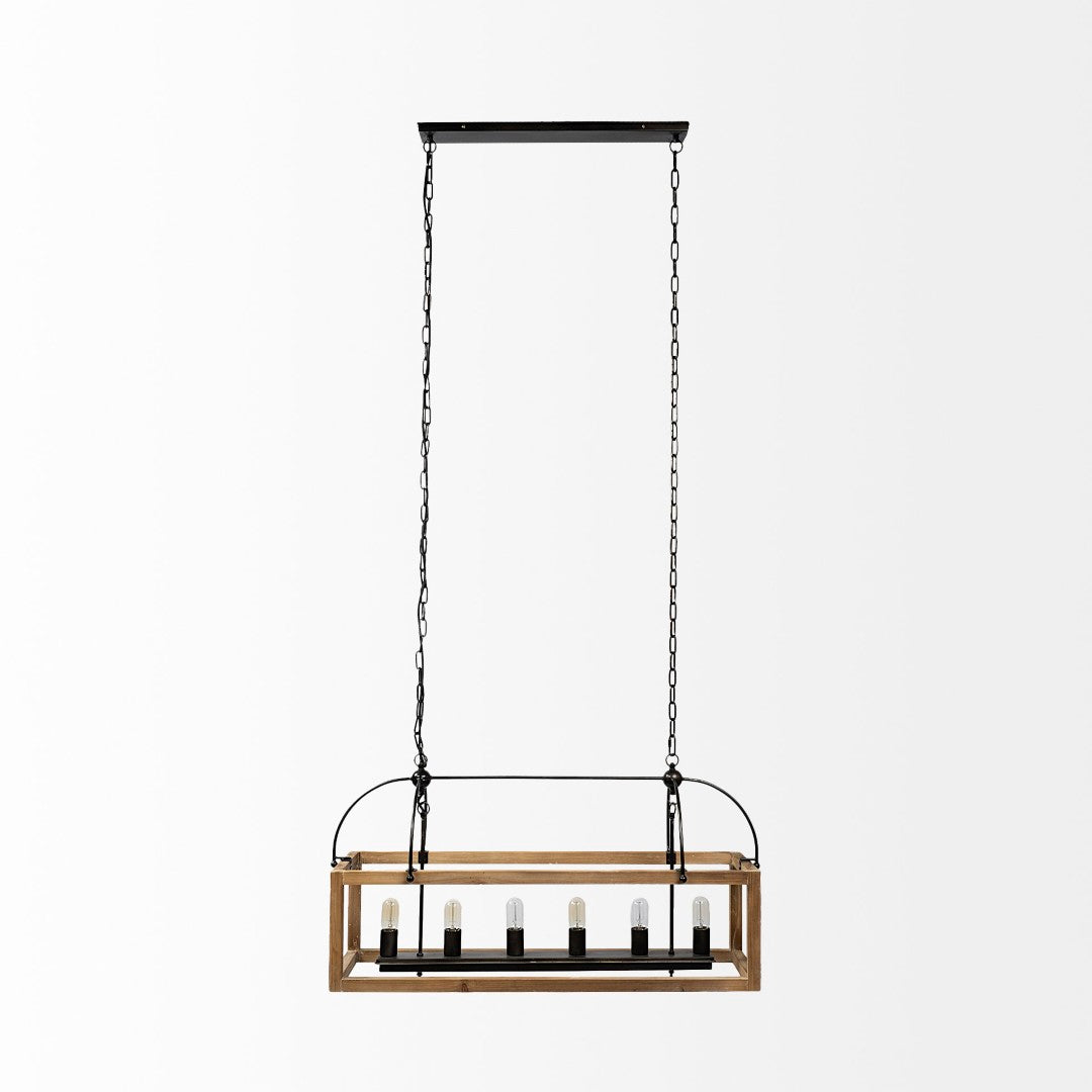 - Design: Island-style, six-light chandelier with a wooden chassis centered within a metal frame for balanced visual weight