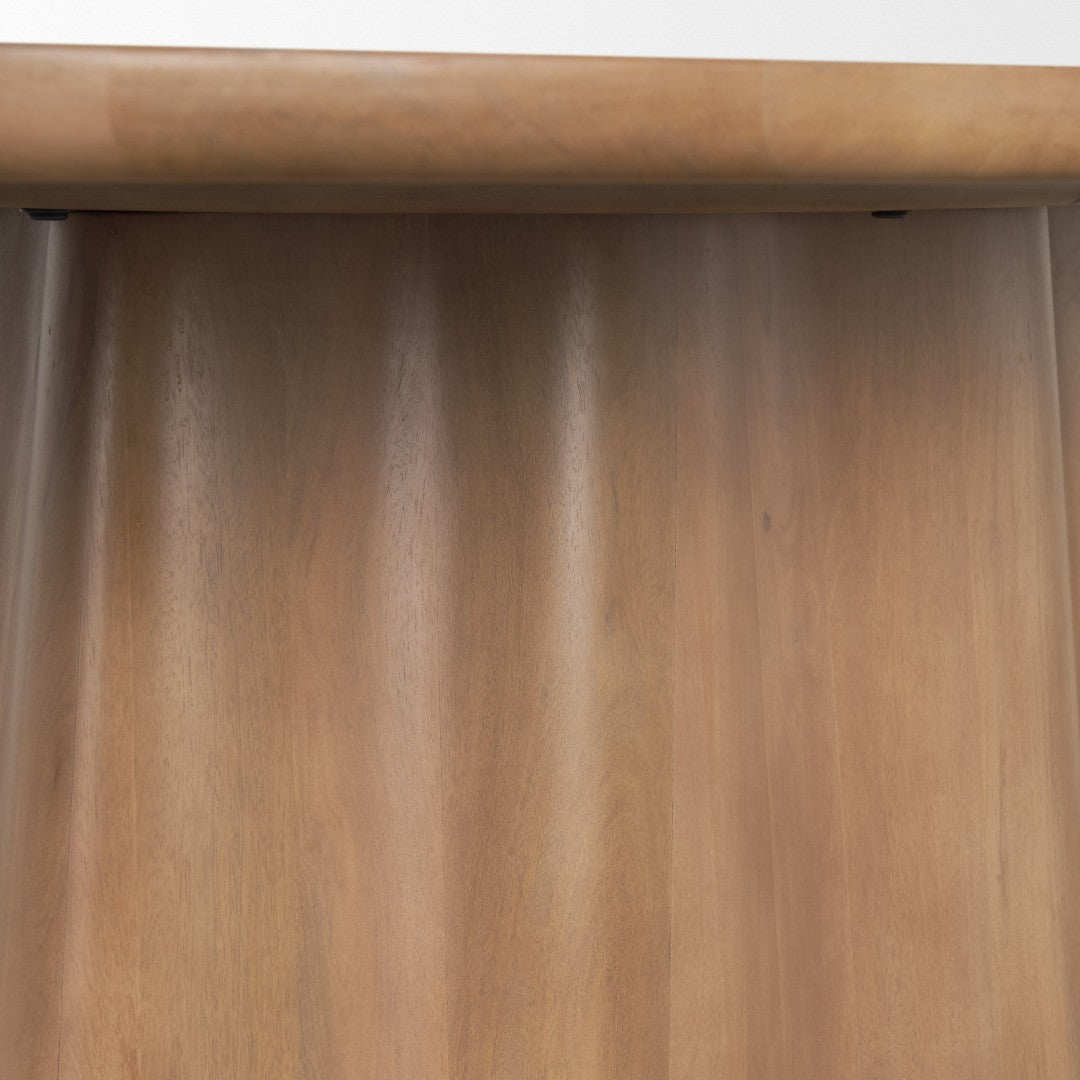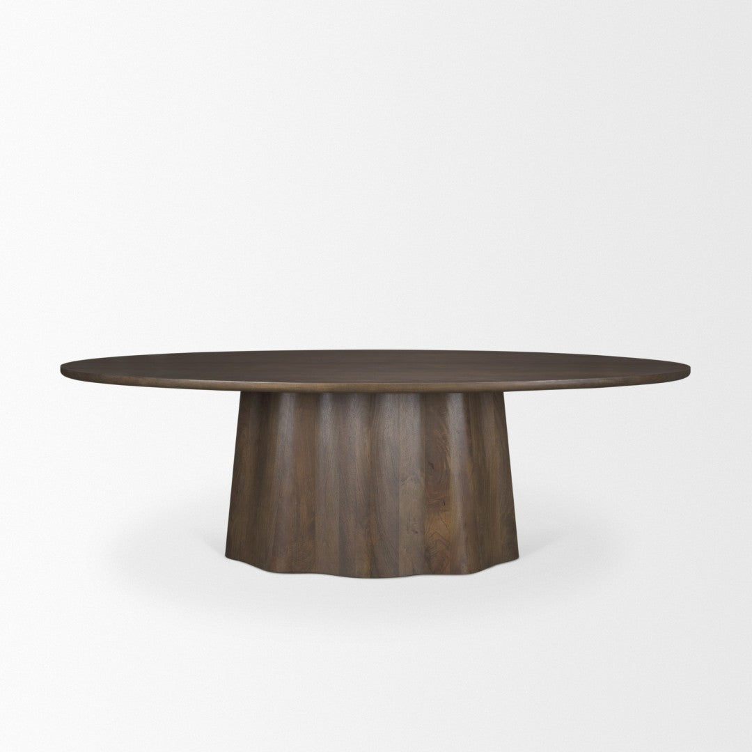 Elevate your dining room with this elegant oval dining table, crafted from solid mango wood and finished in a warm light brown stain. Combining organic curves with a sculptural scalloped pedestal, the table offers a refined yet inviting centerpiece that complements contemporary, transitional, and rustic interiors. Its generous surface accommodates family meals and entertaining, while the rippled detailing of the base adds tactile interest and visual movement.