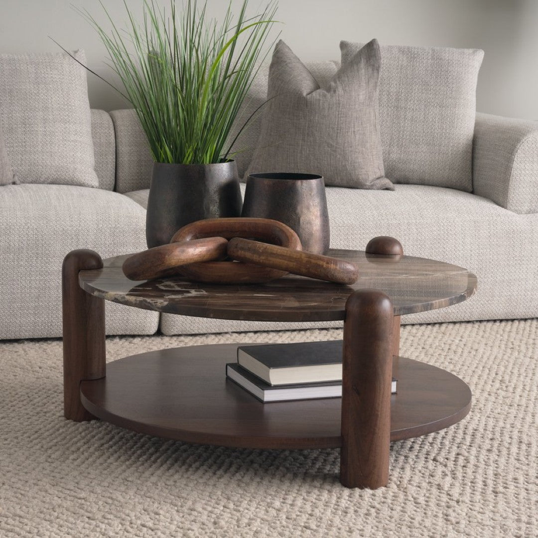 Elevate your living space with this striking round coffee table that pairs rich mango wood craftsmanship with a luxurious cappuccino marble top. Its rounded pillar-style legs and smooth, polished finish create a warm, organic presence while the high-contrast marble surface becomes an eye-catching focal point—ideal for both contemporary and transitional interiors.