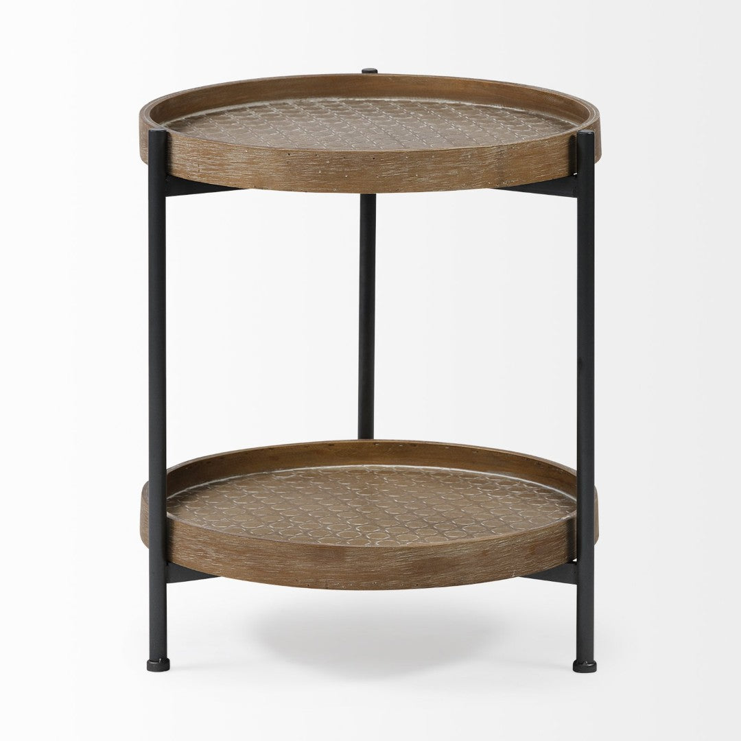 - This round side table comprises two Mango wood tops supported by an iron frame in a shelf-like structure.