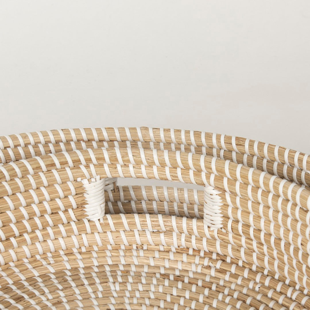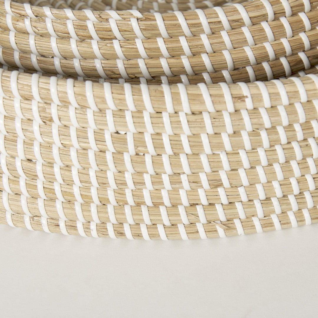 Bring natural texture and coastal charm to your home with this set of two large round seagrass trays. Handwoven from durable seagrass in a warm brown-and-white palette, each tray offers sturdy handles for easy carrying and a versatile surface for serving, styling, or organizing. Perfect for coffee tables, countertops, or as decorative wall hangings, these trays combine practical function with organic beauty.