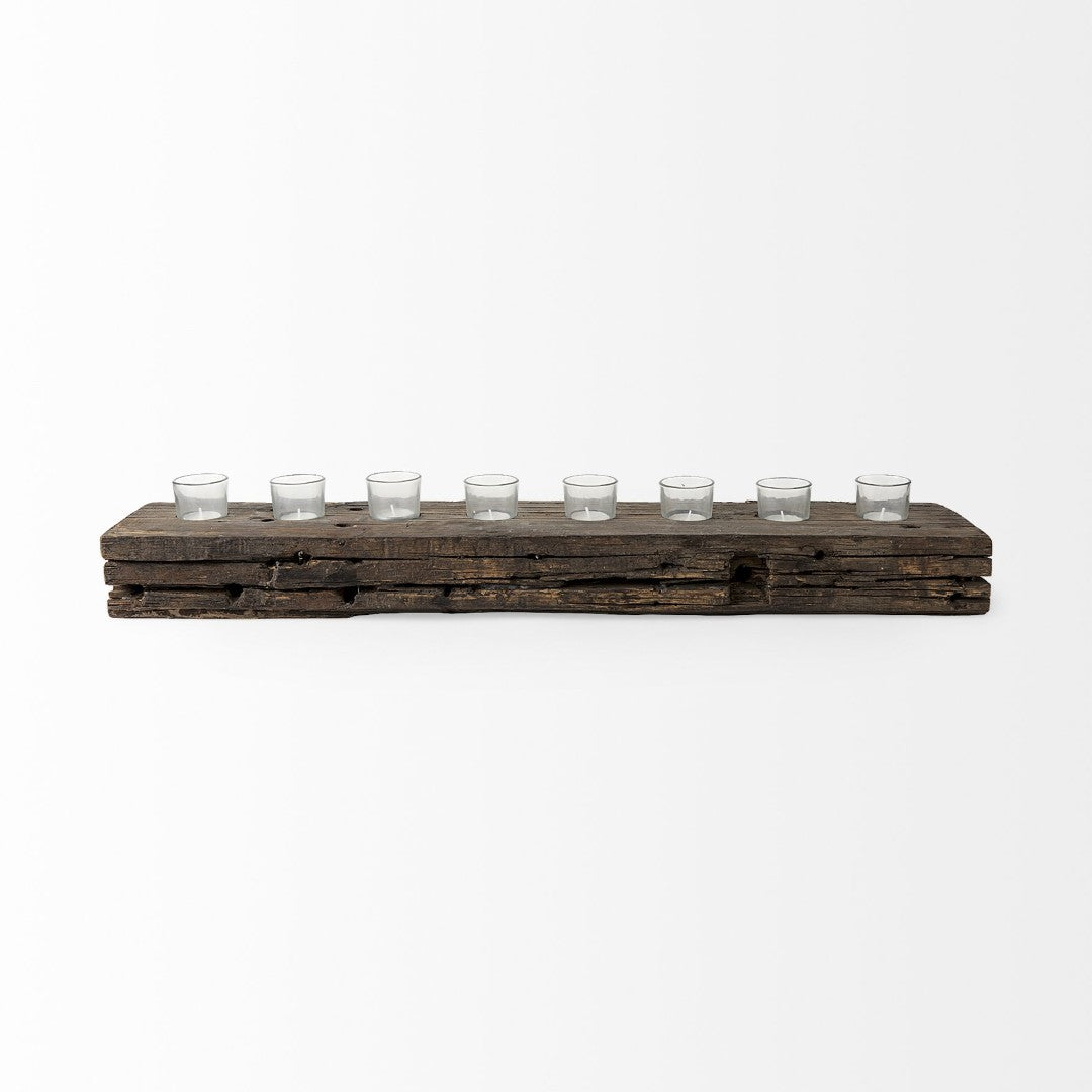 Bring warm, rustic charm to your tabletop with this reclaimed wood candle holder designed to display eight tealights in glass votives. Handcrafted from reclaimed Indian railroad hardwood, each piece carries natural variation in grain, color and finish, making every holder uniquely yours. Its low-profile silhouette and matte-black accents suit farmhouse, industrial, and contemporary interiors while providing a durable, ready-to-display accent for dining tables, mantels, consoles or centerpieces.