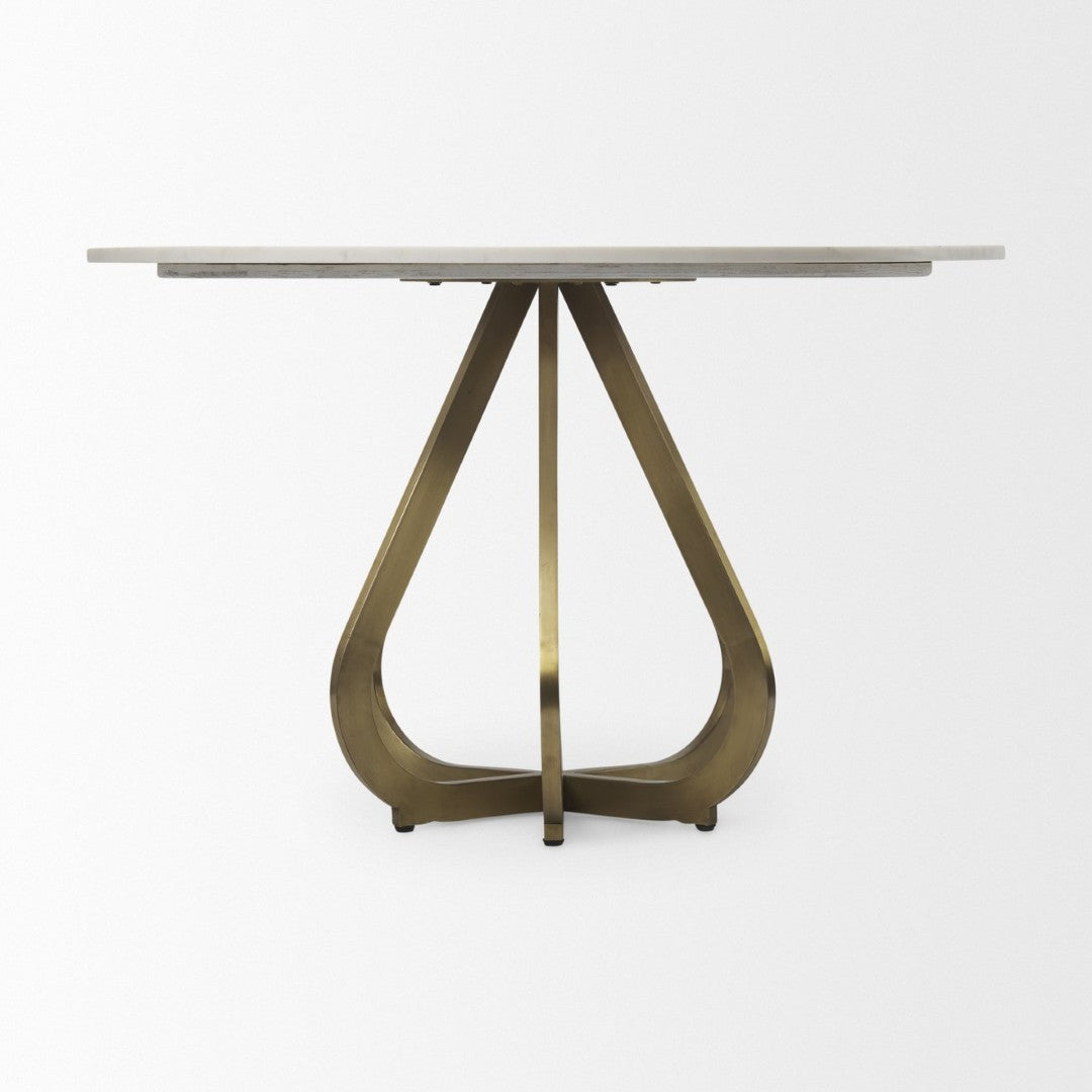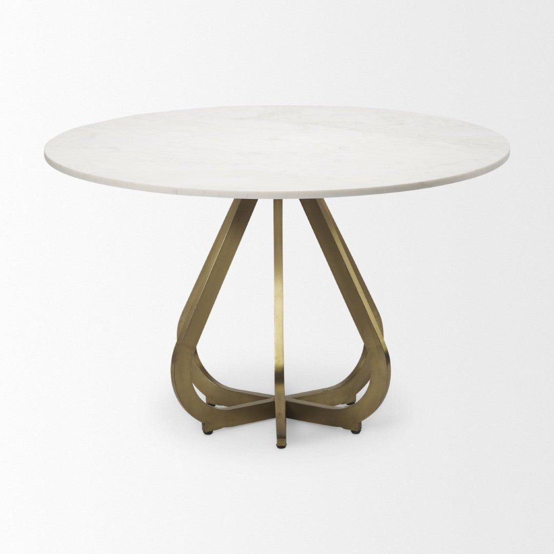- Flaunting a juxtaposition of materials and finishes, the Laurent is a striking piece that features a natural white toned, round marble top braced by an antiqued-gold toned base that looks gorgeous.