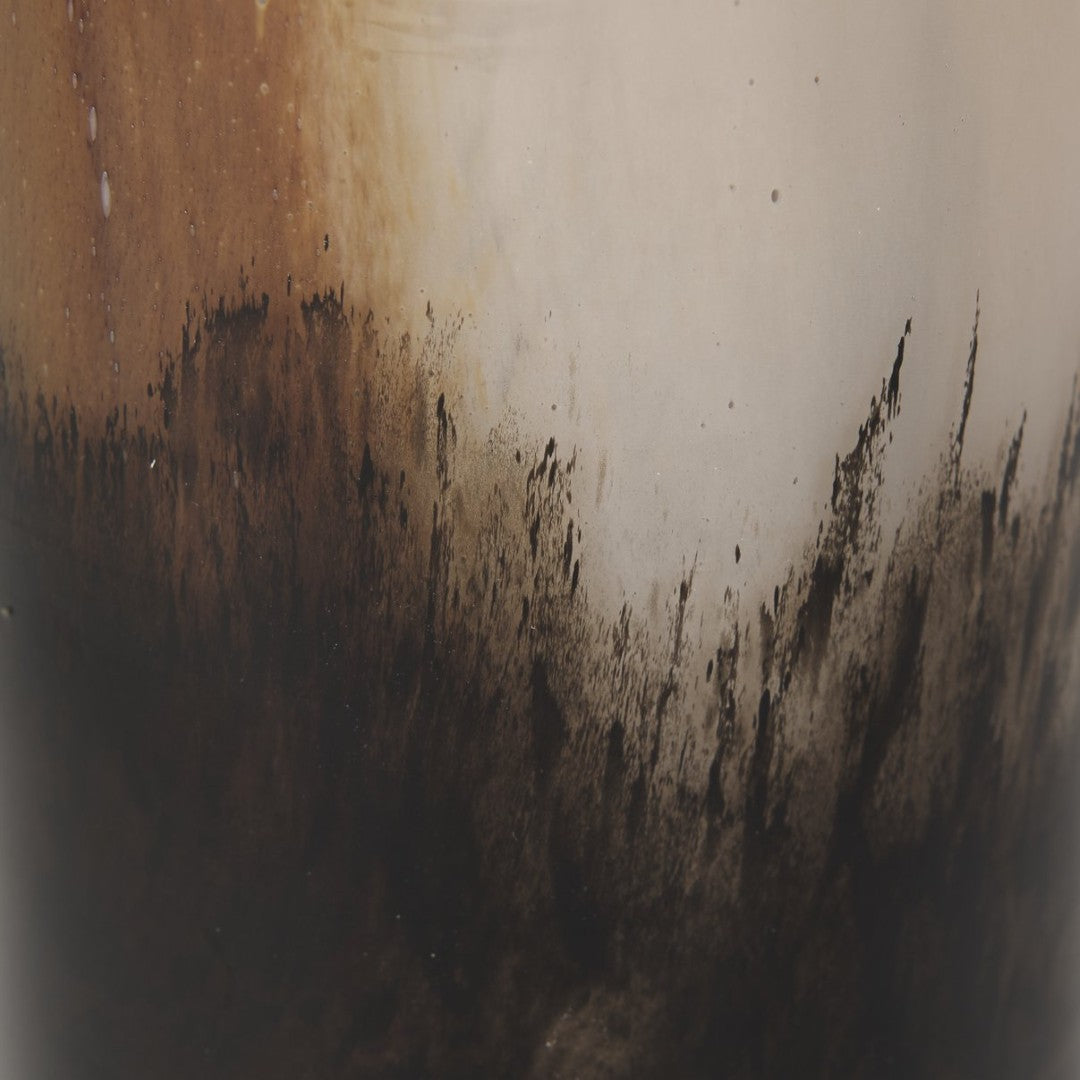 A striking, sculptural piece that brings warm color and artisanal character to any room, this tall amber glass vase features unique swirls of dark brown and cream that create a one‑of‑a‑kind look. Its smooth, polished surface and substantial weight make it equally suited for solo display as a decorative object or as an elegant vessel for fresh or dried botanicals.