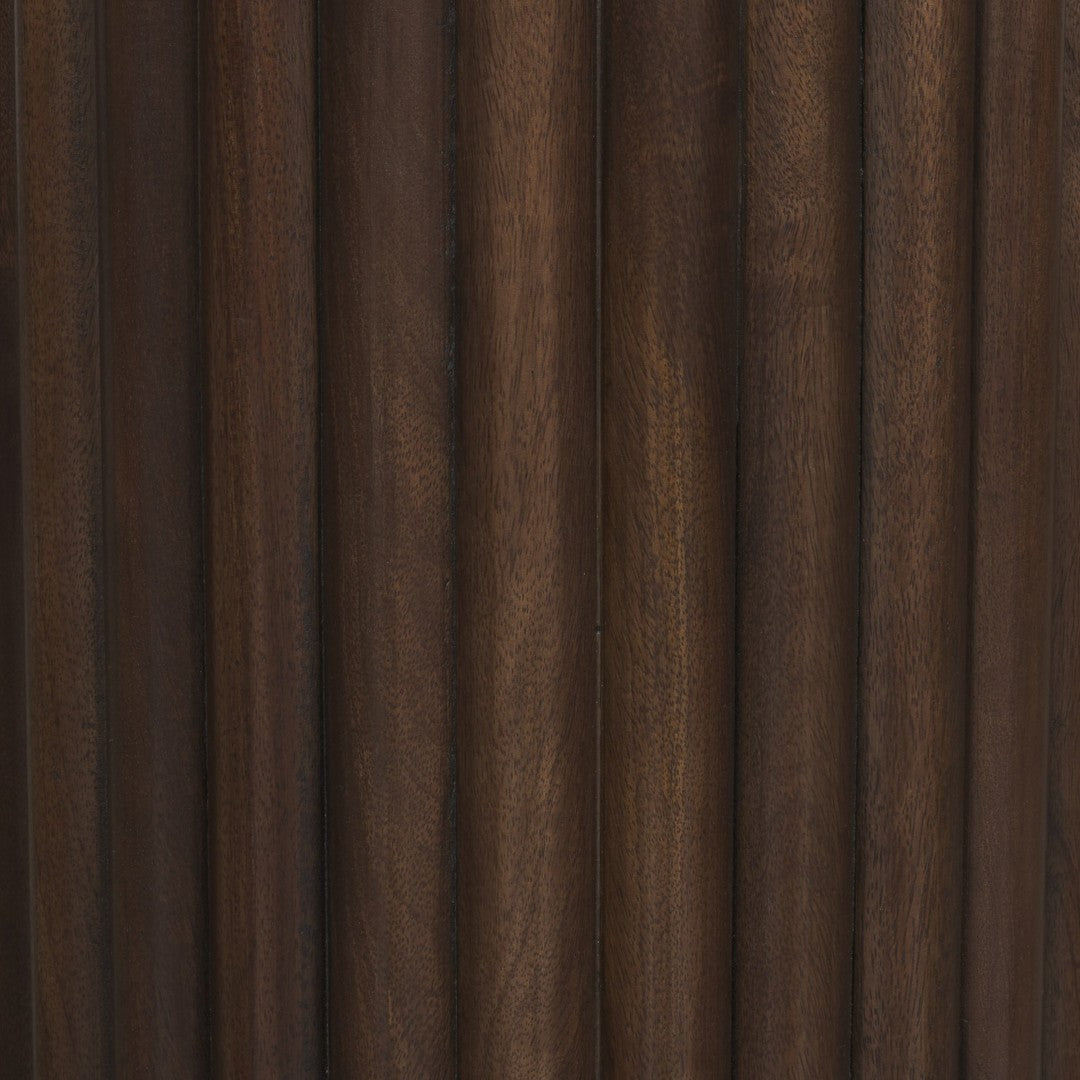 - Base: Wide-fluted, espresso brown solid wood pedestal with a recessed bottom and double-edge profile for architectural detail.