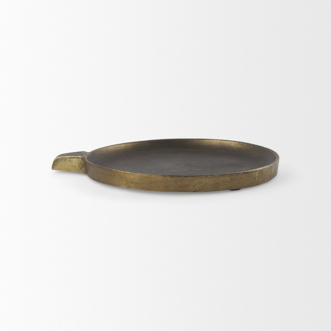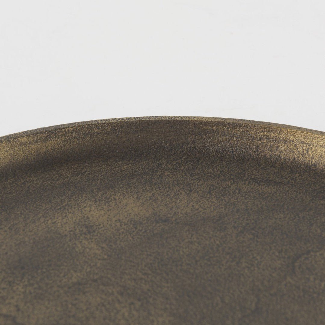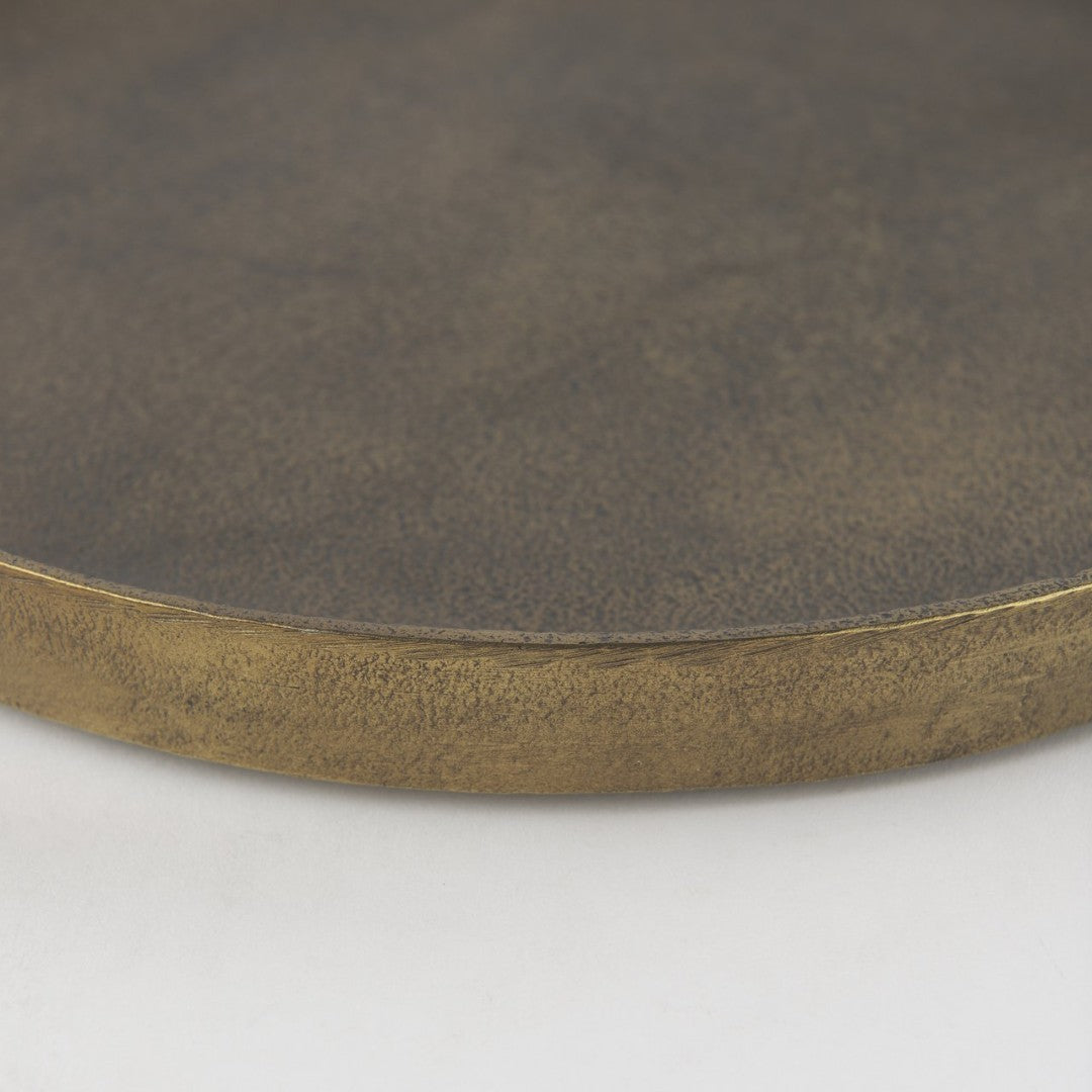 Add a touch of rustic elegance to any room with this small Marlowe aluminum tray. Finished in antiqued matte gold with a textured surface, it blends contemporary and transitional styles while providing a versatile platform for serving, display, or organizing everyday items.