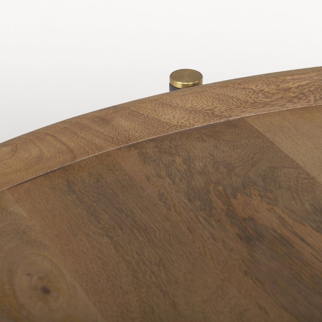 Elevate your living space with the Marquisa small coffee table — a refined blend of natural wood warmth and industrial metal accents. Its circular tray-style tabletop showcases the mango wood's natural grain, while the matte black iron frame and gold metal end caps add visual contrast and structural strength. Compact yet sturdy, this table suits a range of interiors from modern and industrial to coastal and farmhouse.