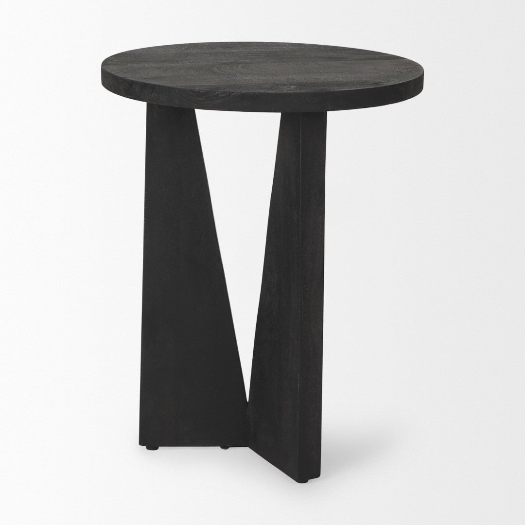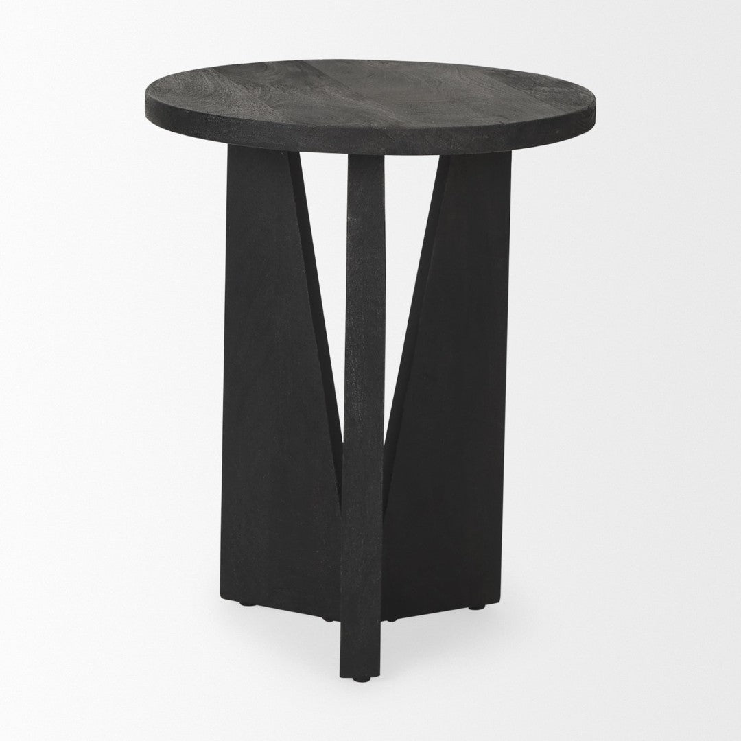 Elevate your living space with this striking black wood accent table, designed to blend modern minimalism with warm, natural materials. Its compact footprint and sculptural three-legged base make it an ideal side table for small spaces, adding both function and visual interest to a sofa, bedside, or entryway.