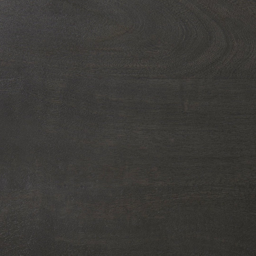 - Finish: Dark brown wood top with cool undertones and bluish-gray highlights; iron rod finished in painted black with subtle gold hints