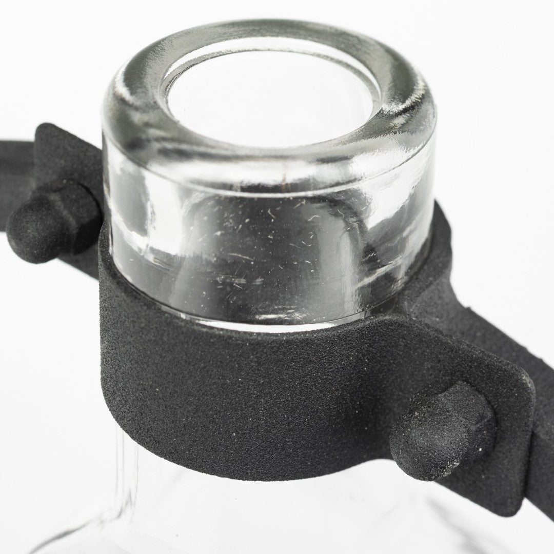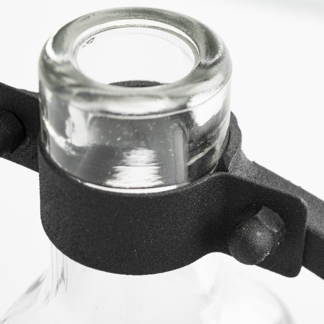 - Materials: Matte black metal frame with a mounted clear glass bottle for durability and visual contrast.