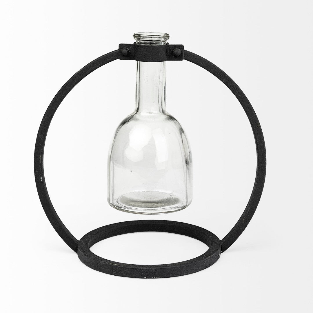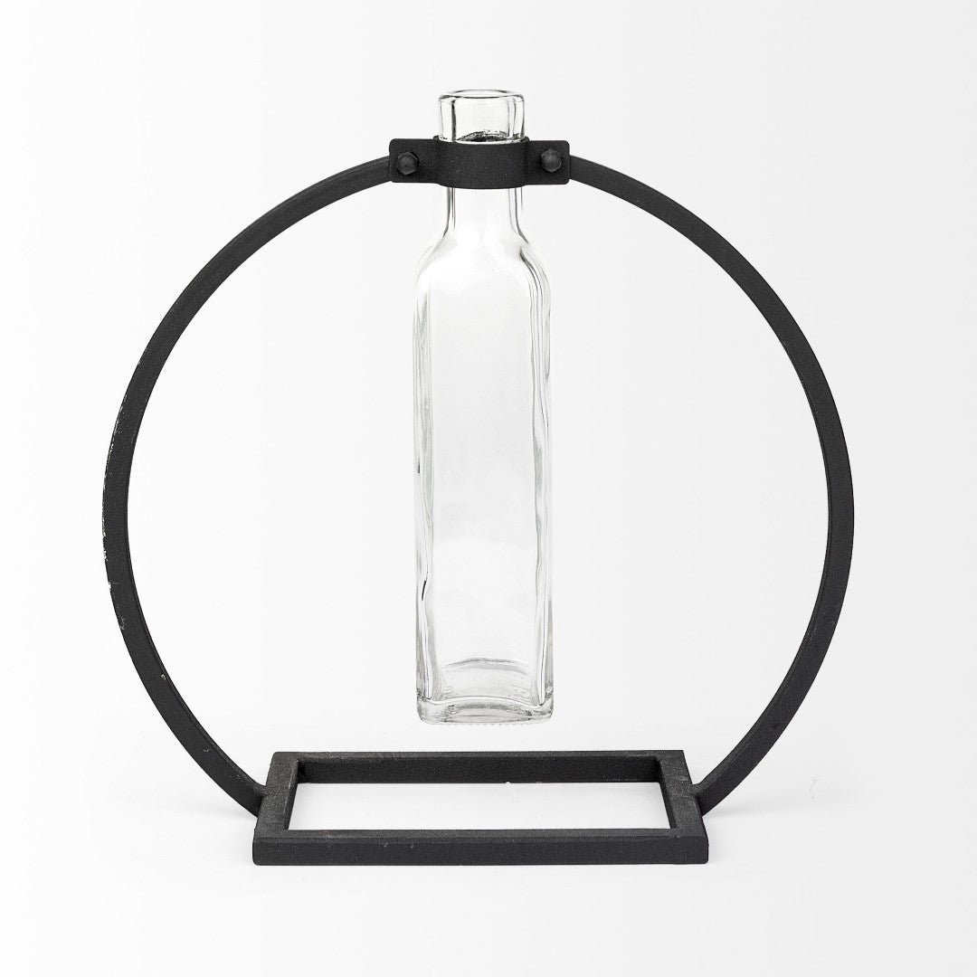 Add a touch of modern-meets-desert charm to any room with this striking black metal and glass bottle vase. Its matte-black metal frame and clear mounted glass bottle create a minimalist yet warm statement piece—ideal for a single stem, a small live or faux succulent, or displayed solo as an artful accent.