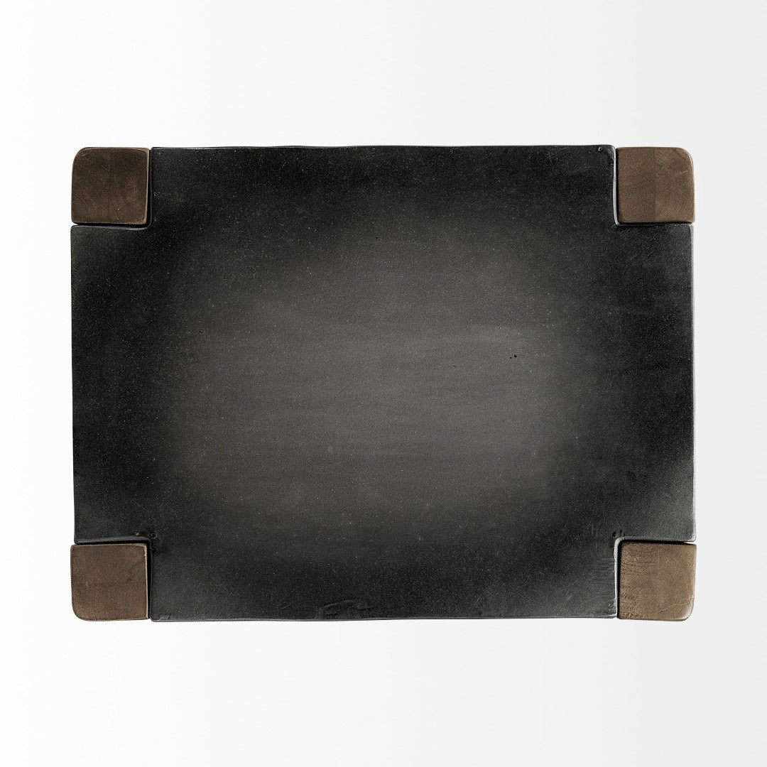 - Materials: Solid mango wood frame with medium brown finish; flat iron metal seat with matte-black finish.