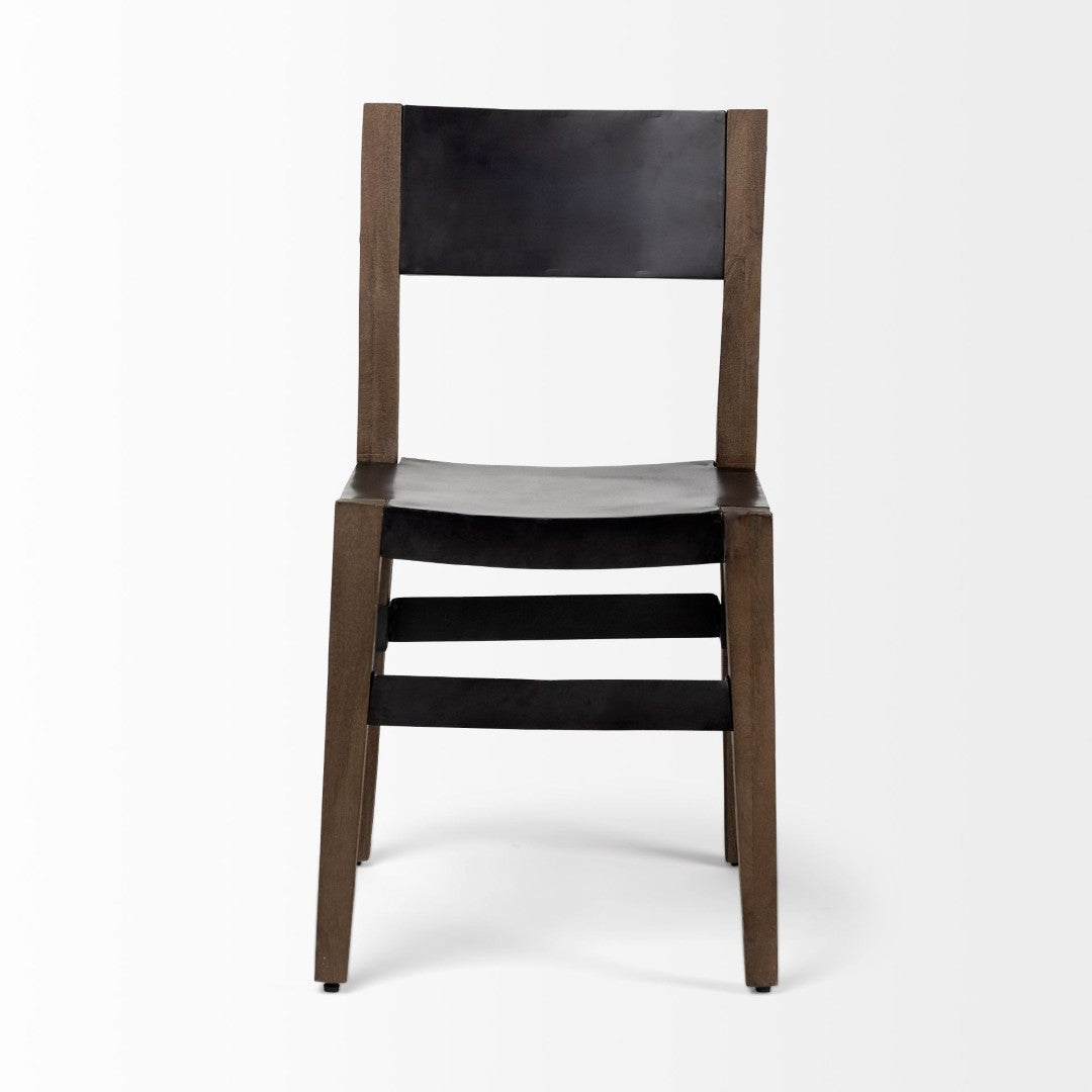 A refined blend of industrial edge and warm, natural wood, this dining chair pairs a matte-black iron seat and back with a solid mango wood base for striking contrast and lasting durability. Its open-back silhouette and medium-brown wood finish highlight the grain while offering a comfortable, supportive seat that fits modern, farmhouse, lodge, and industrial interiors. Delivered fully assembled, it’s ready to elevate your dining area, kitchen nook, or commercial seating space.