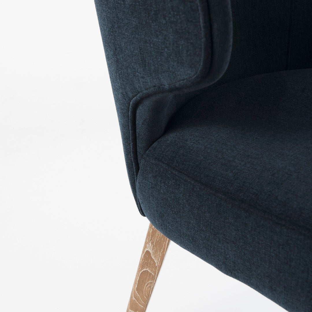 Enjoy sculptural comfort and refined style with the Niles wingback dining chair. Wrapped in deep navy fabric and supported by warm medium-brown wooden legs, this chair blends timeless upholstery with durable construction to elevate dining rooms, home offices, or accent seating areas. Its curved wingback and plush padding deliver structured yet relaxed comfort for meals, work sessions, or conversations.