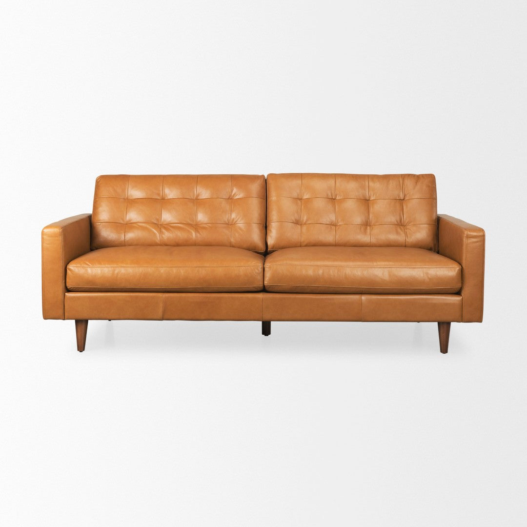 A refined blend of relaxed modern design and premium craftsmanship, this tan leather sofa offers lasting comfort and a lived-in elegance that improves with time. Its low-profile silhouette, blind-tufted back cushions, and tapered wood legs make it a versatile focal point for contemporary or transitional living spaces, while top-grain leather and solid construction ensure durability and authentic character.